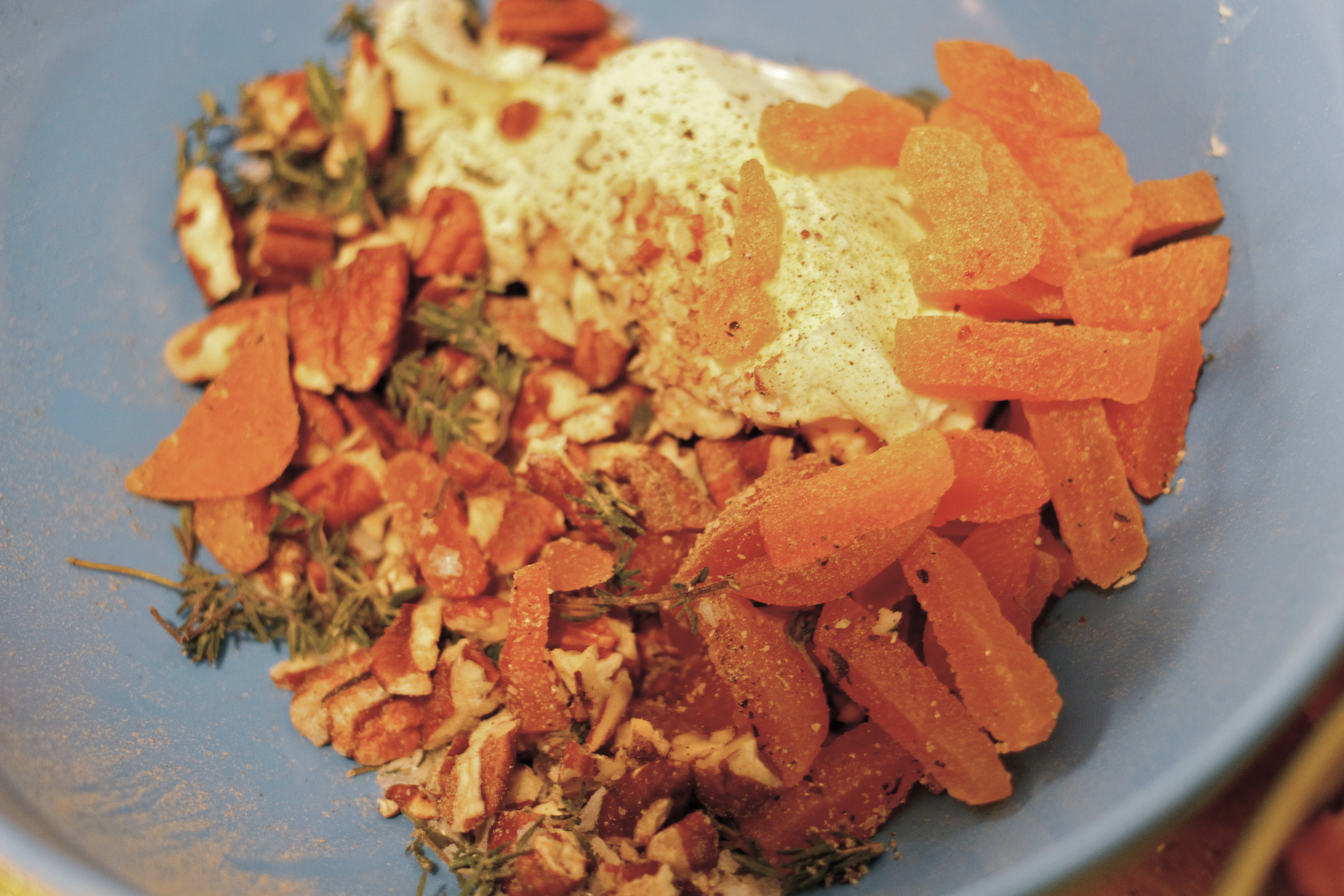 Hin var um 75 g af rjómaosti, sirka 75 g af þurrkuðum apríkósum, söxuðum, svona 40 g af grófsöxuðum pekanhnetum, blöðin af nokkrum timjangreinum (eða dálítið þurrkað timjan, pipar og salt. Ég hrærði báðar fyllingarnar saman, sína í hvorri skál.