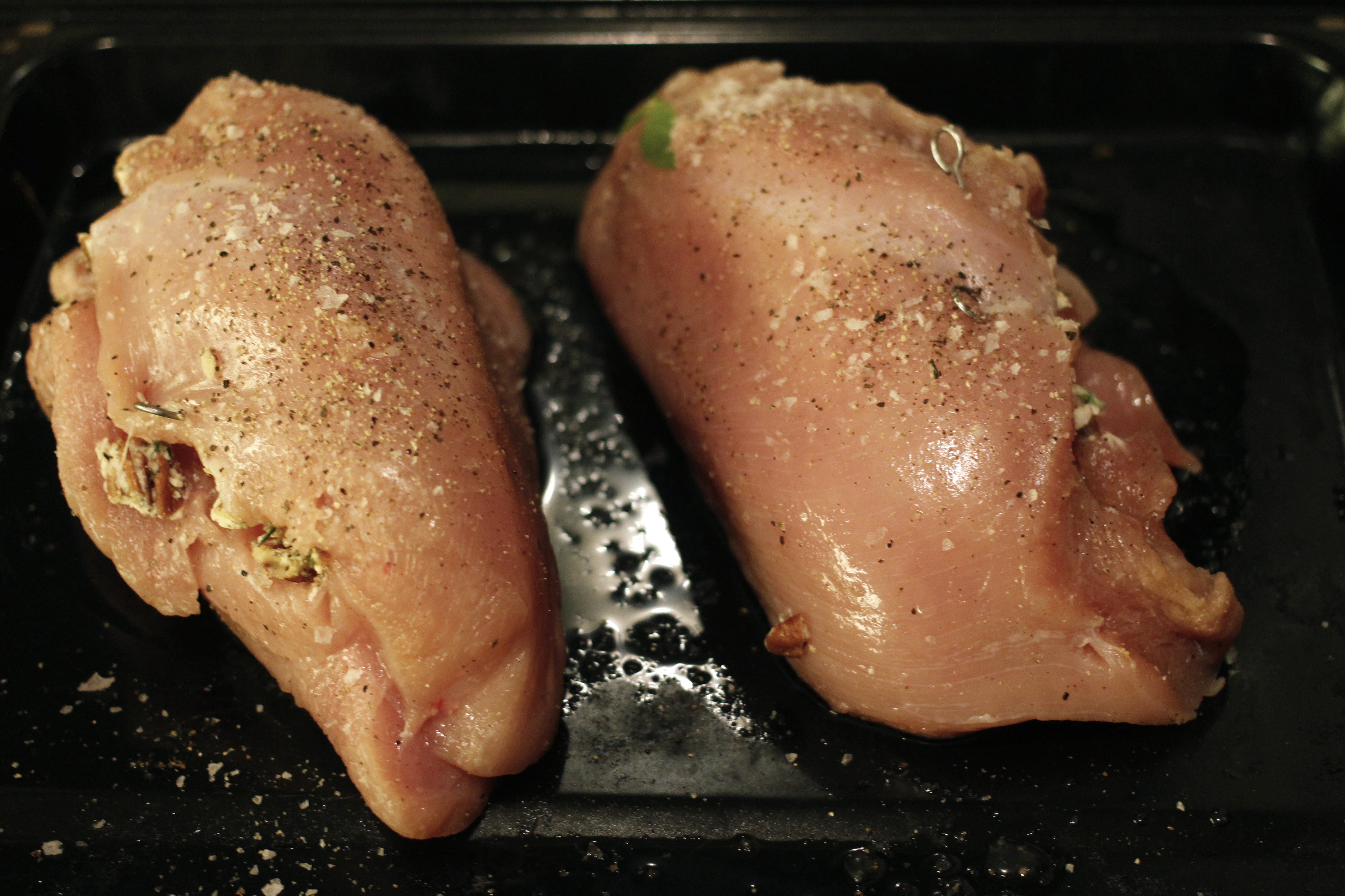 Ég var búin að hita ofninn í 200°C og setti nú bringurnar í olíuborna ofnskúffu. Hefði auðvitað komist af með eldfast mót en ég ætlaði að baka grænmeti með þeim.