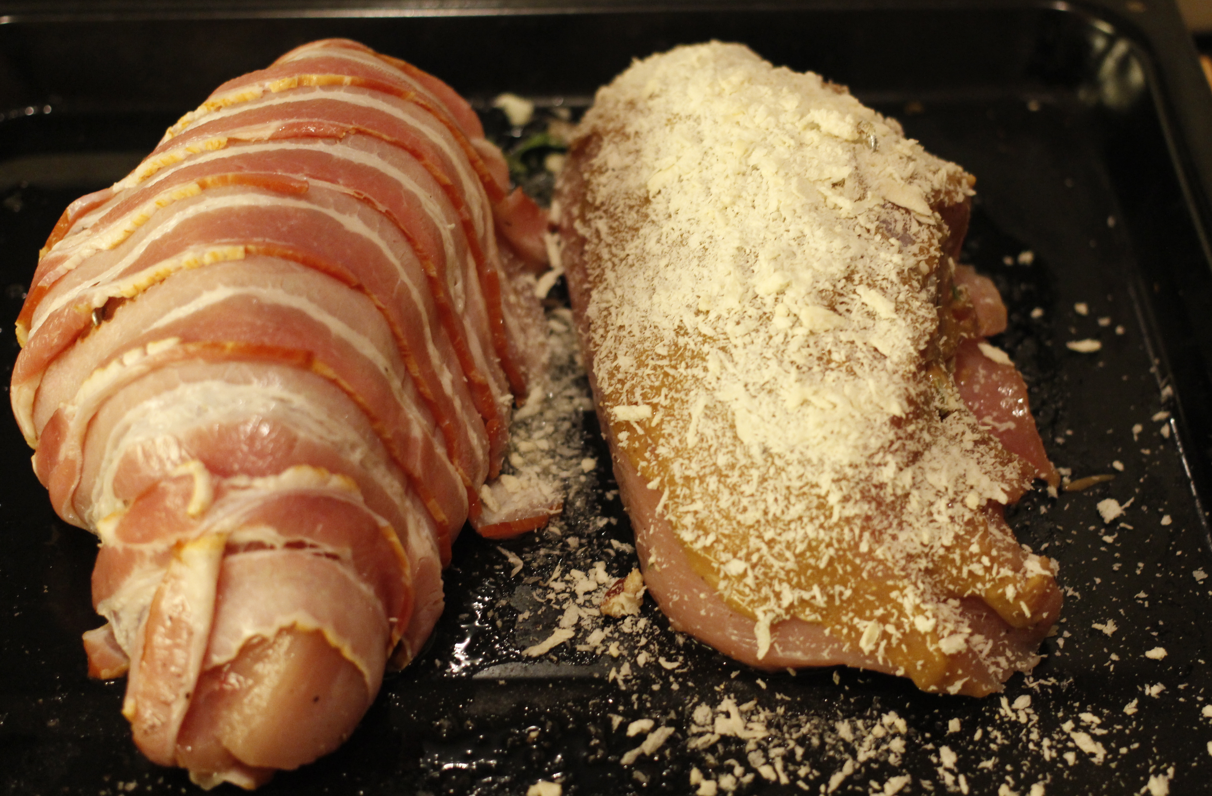 Svo skar ég djúpan vasa í hliðina á hvorri kalkúnabringu (þær voru semsagt rétt þiðnaðar) og kryddaði bringurnar að innan og utan með dálitlum pipar og salti. Mótaði fyllinarnar í sverar lengjur og setti inn í bringurnar. Þrýsti aðeins á þær til að þær færu sem best inn í endana á vösunum. Ég lokaði vösunum með kjötnálum en það er nú líklega óþarfi, allavega með þá beikonvöfðu (sjá á eftir).