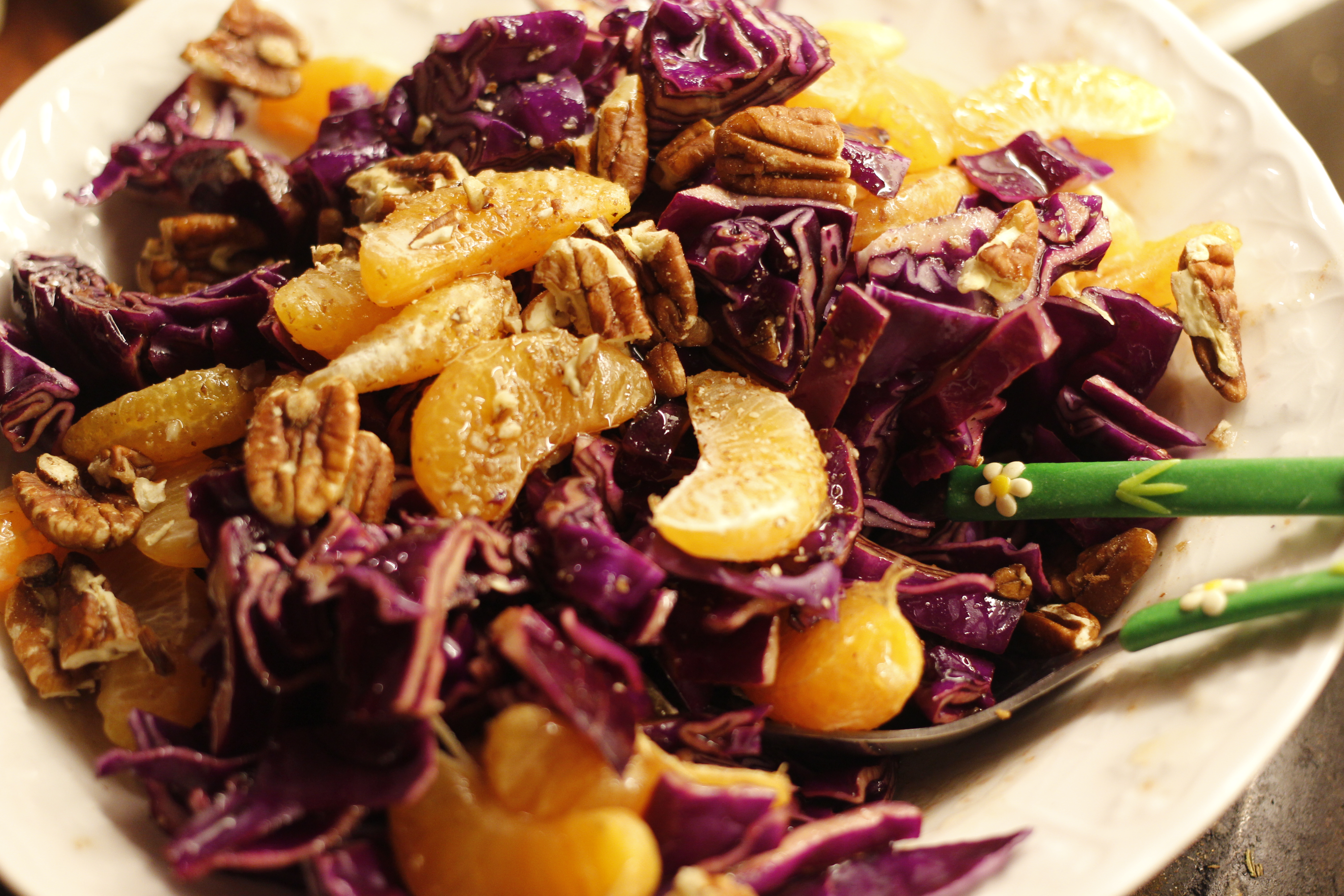 … og rauðkálssalati (lítill rauðkálshaus, nokkrar mandarínur, grófmuldar pekanhnetur, ólífuolía, hvítvinsedik, balsamedik, pipar og salt).