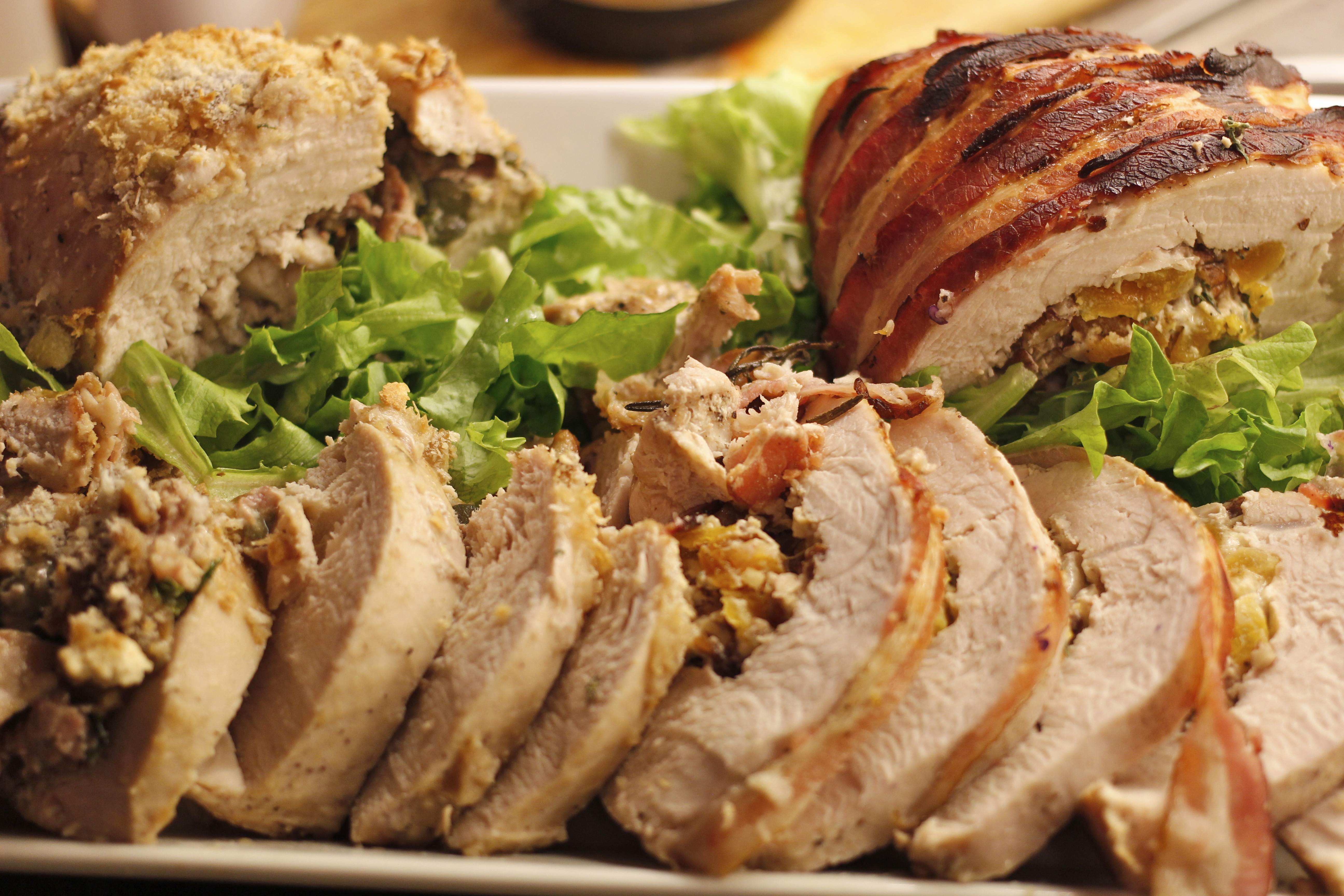 Ég var beðin um uppskrift að fylltum kalkúnabringum sem ég eldaði á nýársdag. Eiginlega var þetta ekki ætlað á bloggið og myndatakan ekki miðuð við það en ég lenti í smávandræðum sem ég sagði frá á Facebook og birti svo mynd af bringunum til að sýna að þetta hefði nú allt reddast … svo að jæja, hér er uppskriftin. Eða kannski uppskriftirnar því að ég var með tvær útgáfur af bringunum.
