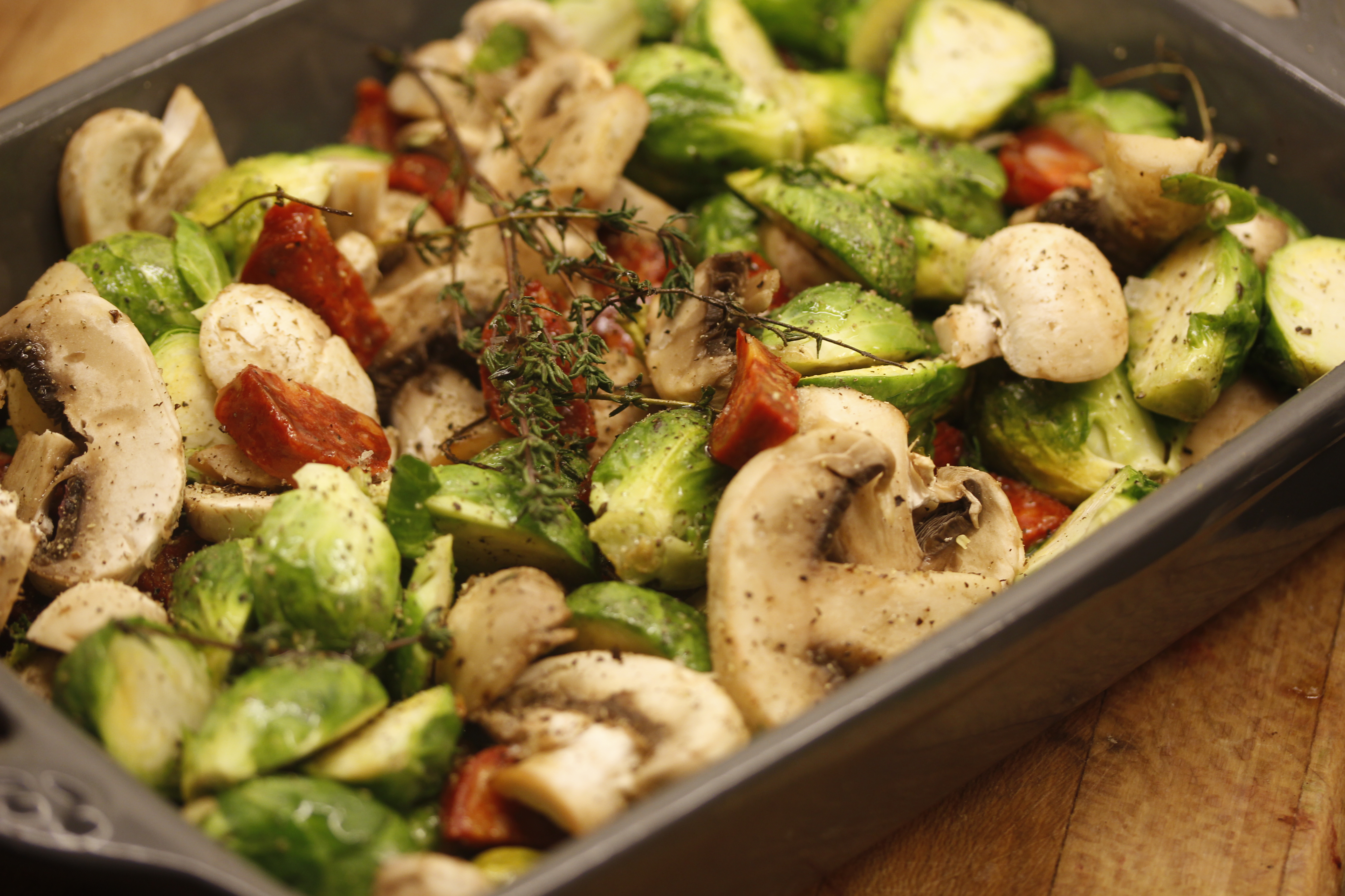 Ég setti rósakálíð, sveppina og timjanið í eldfast mót og saxaði hvitlaukinn smátt og dreifði yfir. Þetta getur alveg verið grænmetisréttur en ég átti sirka 100 g bút af chorizopylsu, skar hann í tvennt eftir endilöngu og svo í þunnar sneiðar og setti í mótið með rósakálinu. Kryddaði með pipar og salti og svo hellti ég 2 1/2 msk af ólífuolíu yfir og blandaði vel.
