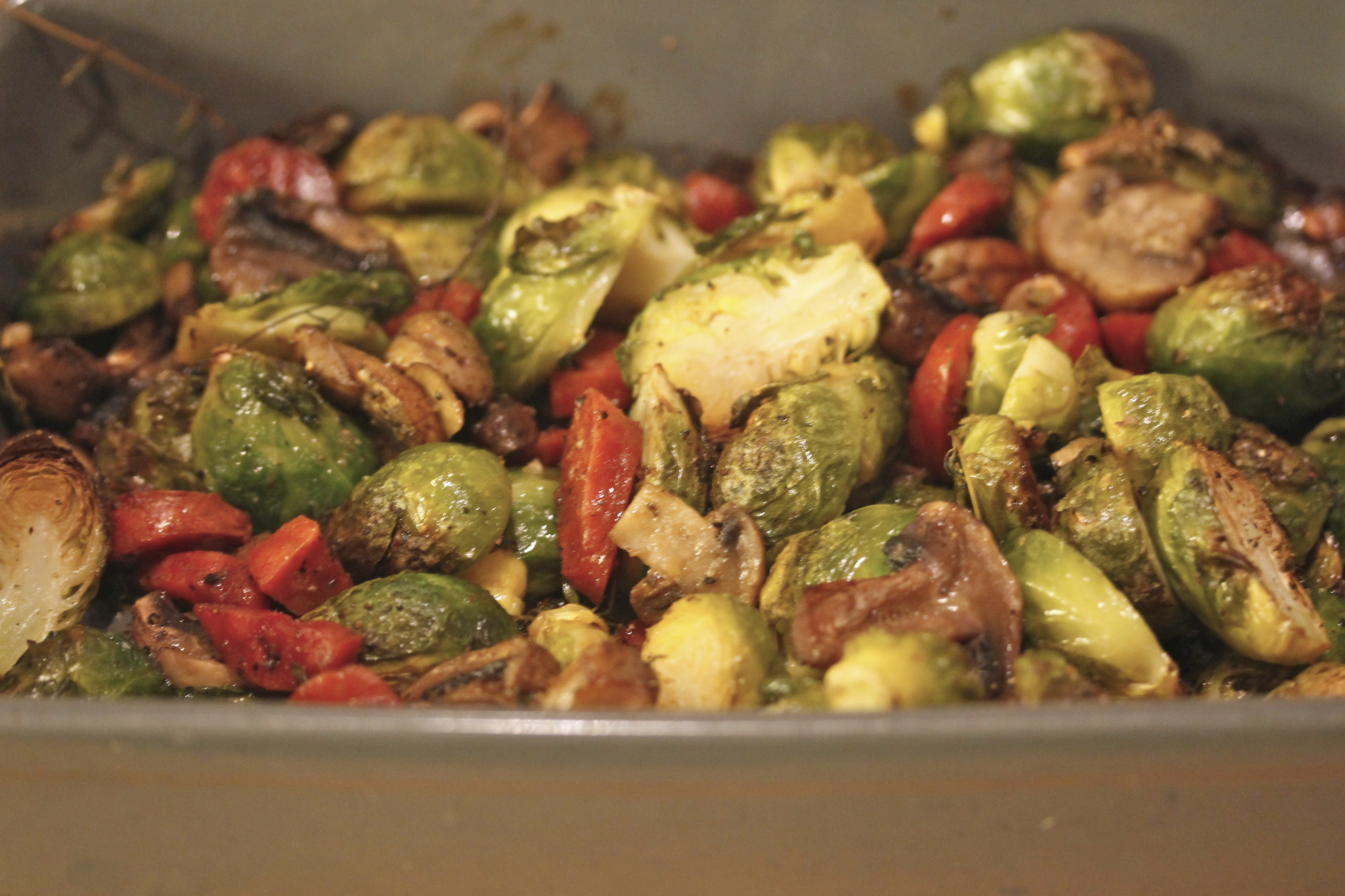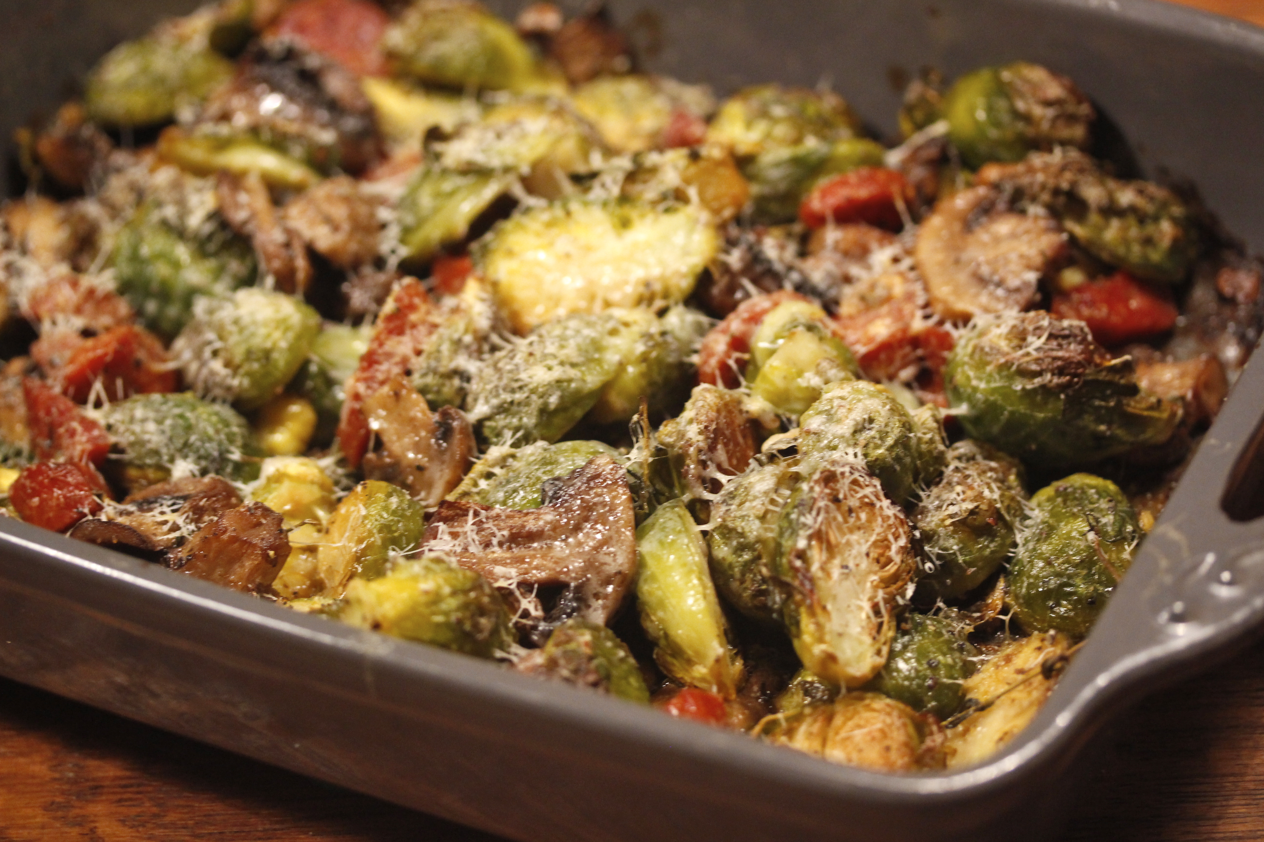 Svo setti ég fatið í ofninn og bakaði þetta í hálftíma, eða kannski rétt tæplega það. Þá tók ég fatið út – rósakálið ætti að vera orðið meyrt og búið að taka dálítinn lit.