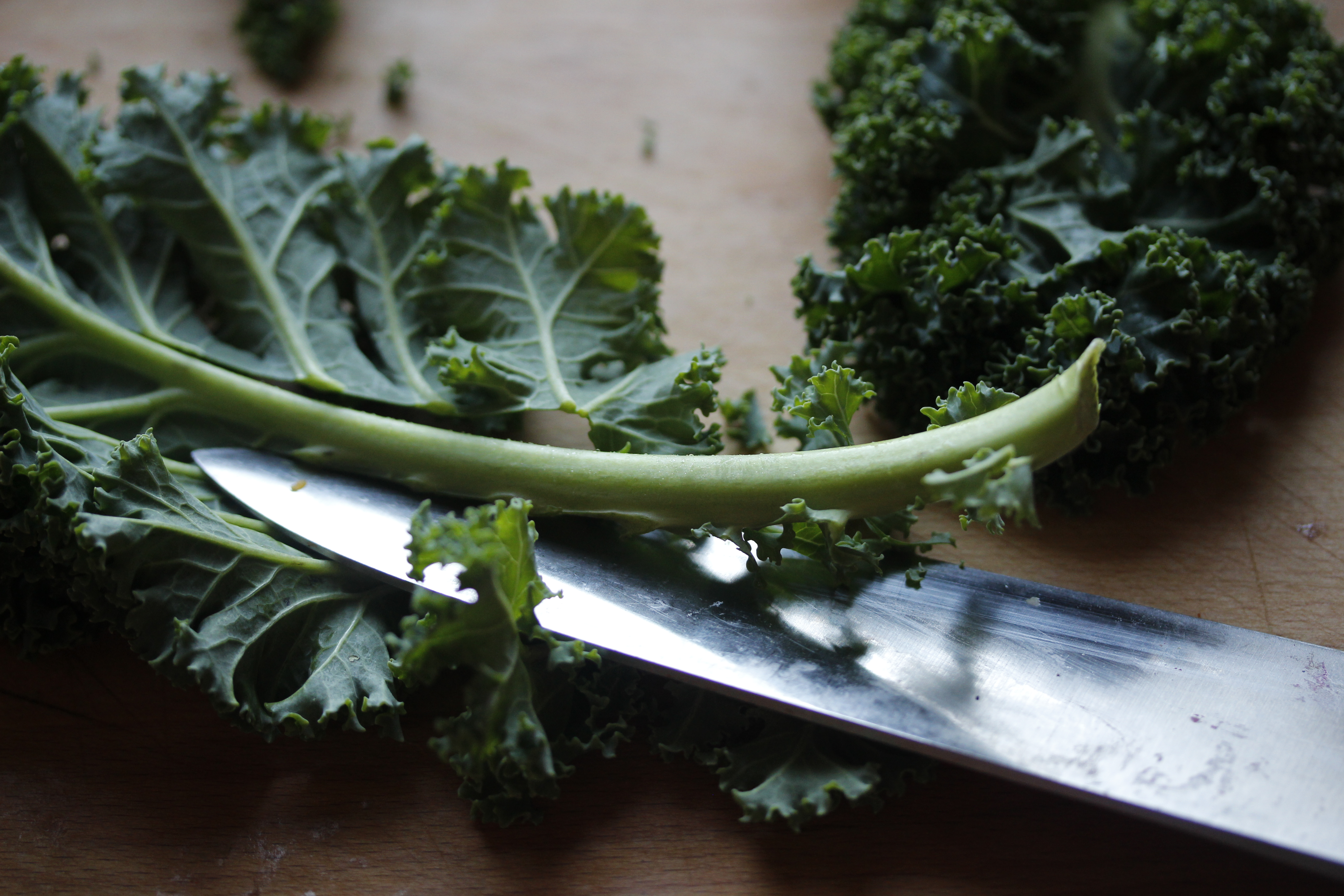 Ég byrjaði á að taka svona 200 g af grænkáli. Skar stöngulinn úr grænkálsblöðunum og skar þau svo í fremur mjóar ræmur. Saxaði líka tvo hvítlauksgeira smátt.