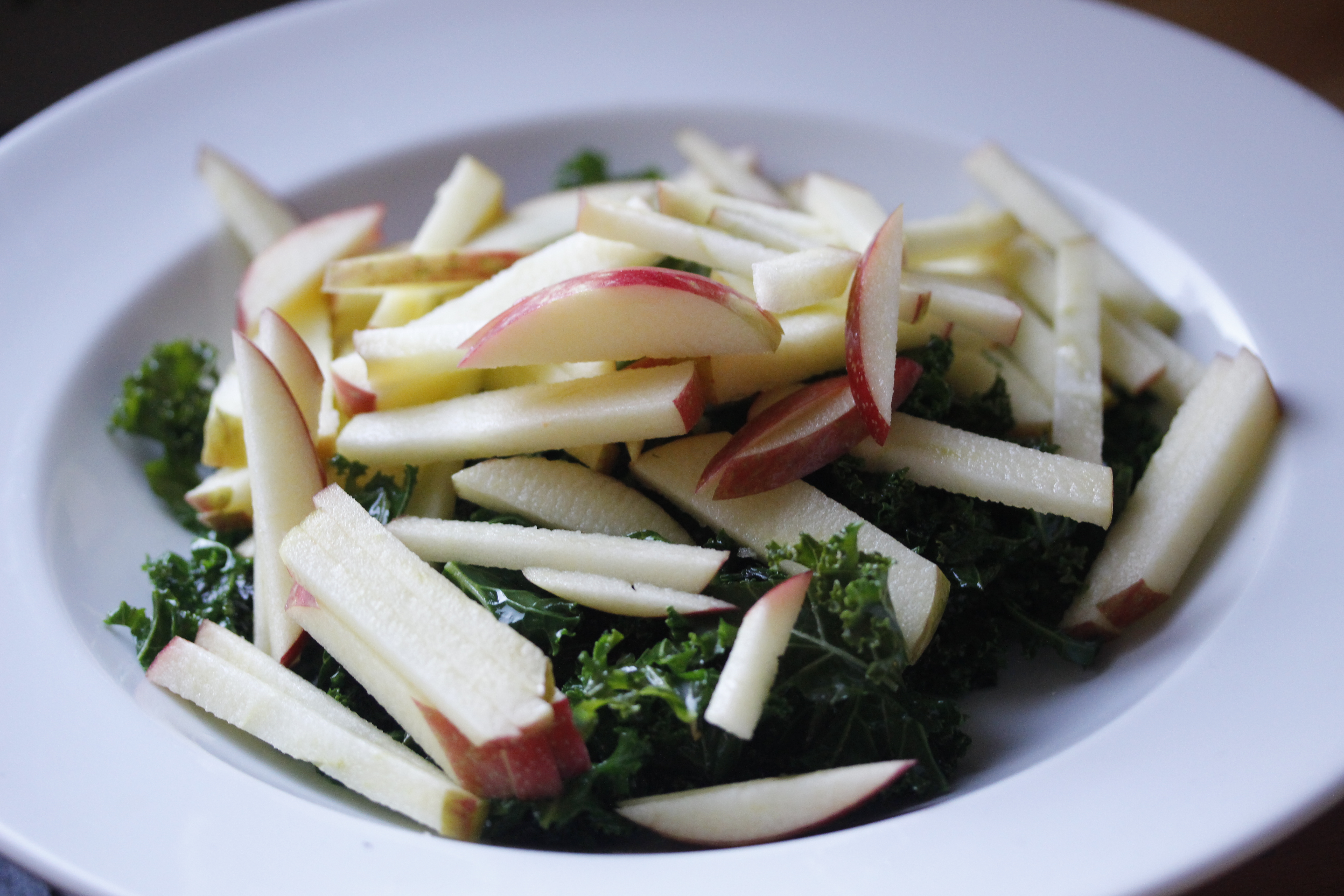 Svo tók ég tvö epli (geta náttúrlega verið nokkurn veginn hvaða epli sem er en mér finnst best að nota stökk og safarík epli eins og Pink Lady eða Honeycrisp). Ég kjarnhreinsaði þau og skar þau í fremur litla bita. Það má auðvitað flysja þau en mér finnst betra að hafa hýðið með.