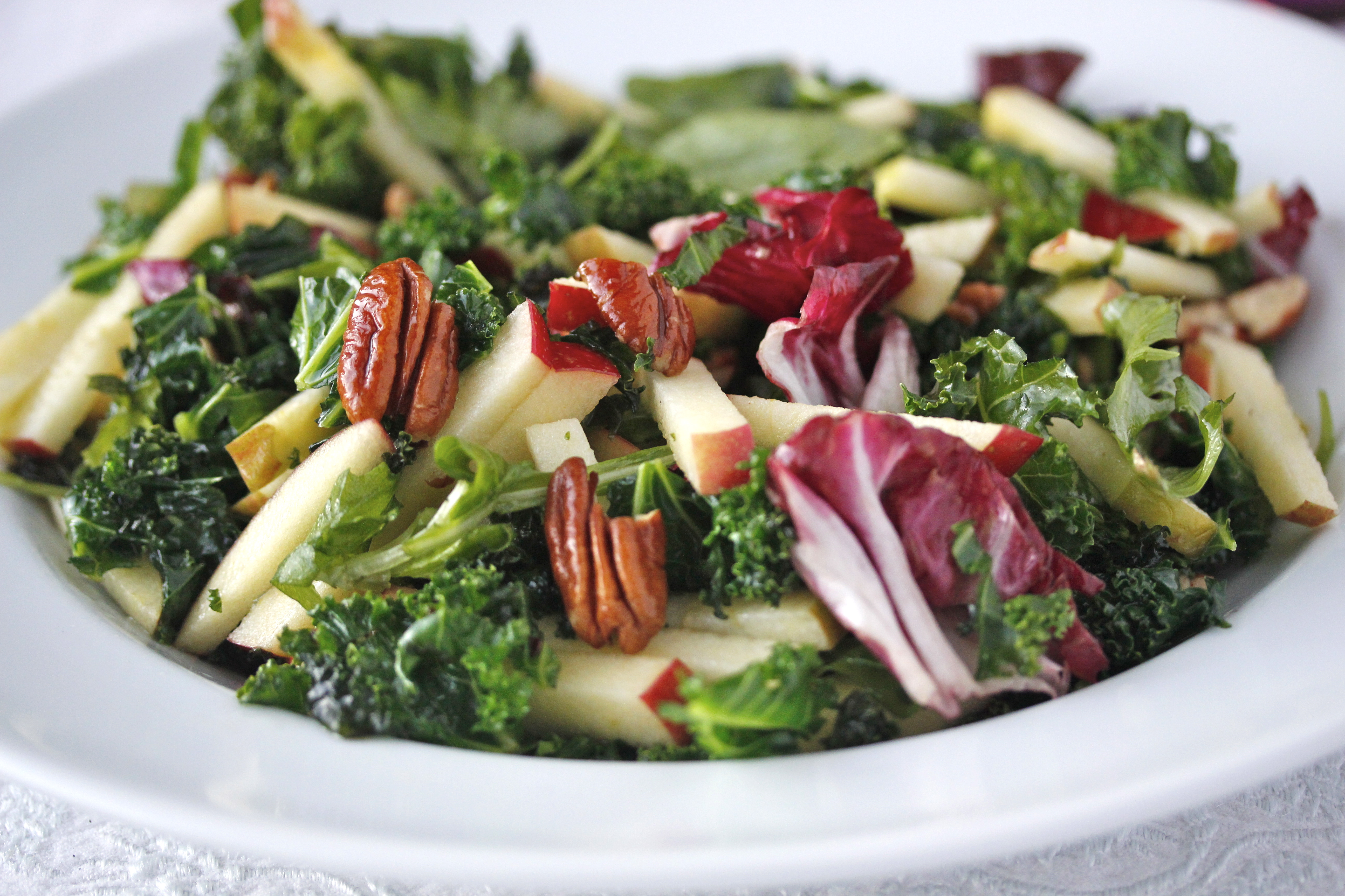 En áður en ég fer að mynda góða kjötið og góðu mjólkina og góða fiskinn ætla ég samt að koma með uppskrift að góða grænmetinu og myndir sem ég tók af því. (Ég er að vísu ekki alveg búin að ná þessari nýju tækni, símanum, nota ennþá gamaldags myndavél en það breytist örugglega bráðum.) Það eru reyndar útlensk epli og hnetur í salatinu en uppistaðan er semsagt gott íslenskt grænmeti, grænkál og salatblöð. Uppskriftin birtist fyrst í jólablaði MAN en salatið á afskaplega vel við núna þegar allir eru í hollustunni. Meira að segja ég, svona stundum.