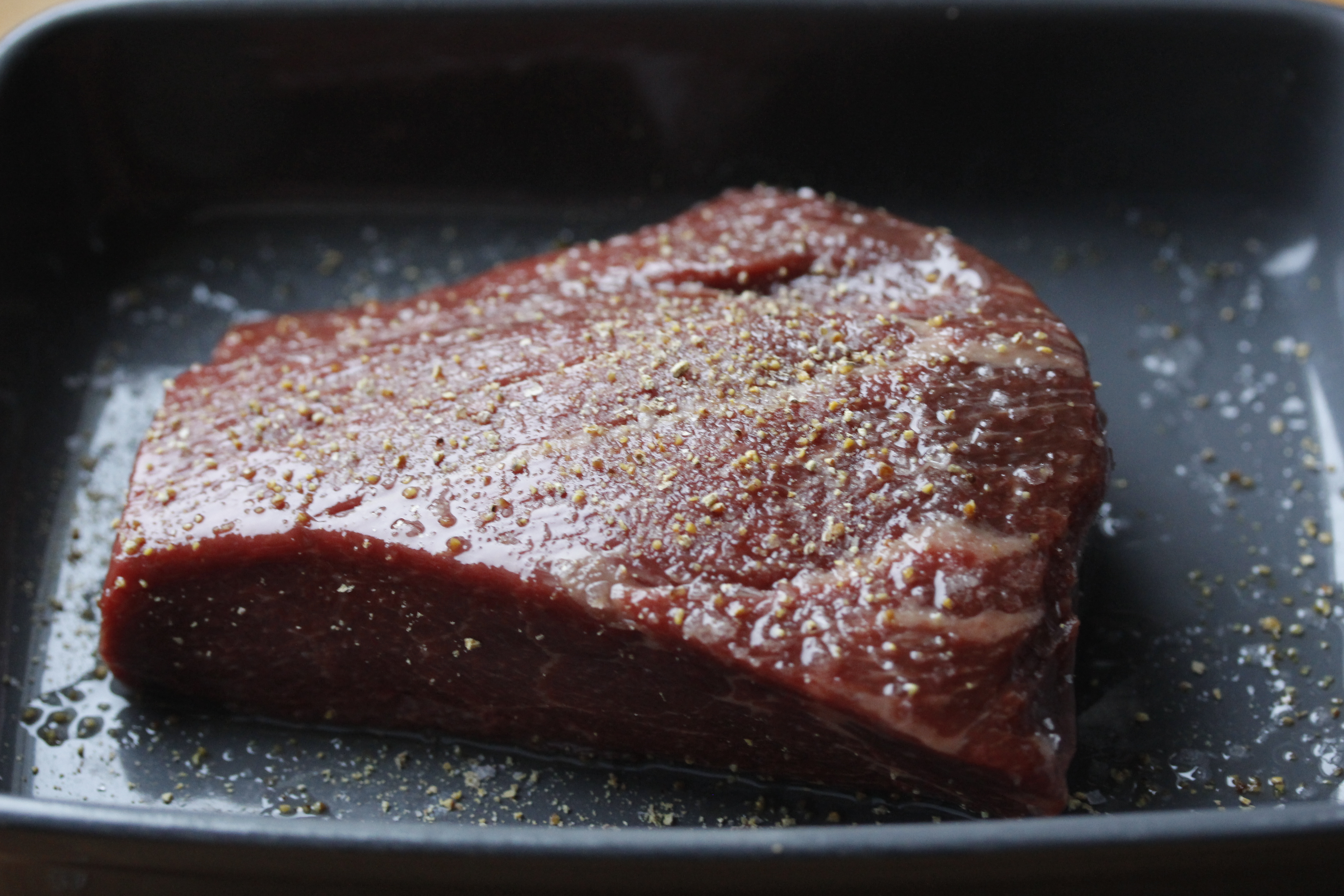Ég byrjaði á að kveikja á ofninum og stilla hann á 160°C. Svo setti ég ögn af olíu í frekar lítið, eldfast mót, velti kjötstykkinu (sem ég hafði tekið úr kæli hálftíma fyrr eða svo) upp úr olíunni og kryddaði það með nýmöluðum pipar og íslensku flögusalti á báðum hliðum. Þetta var vel fitusprengdur biti og líklega svona 5 cm þykkur þar sem hann var þykkastur.