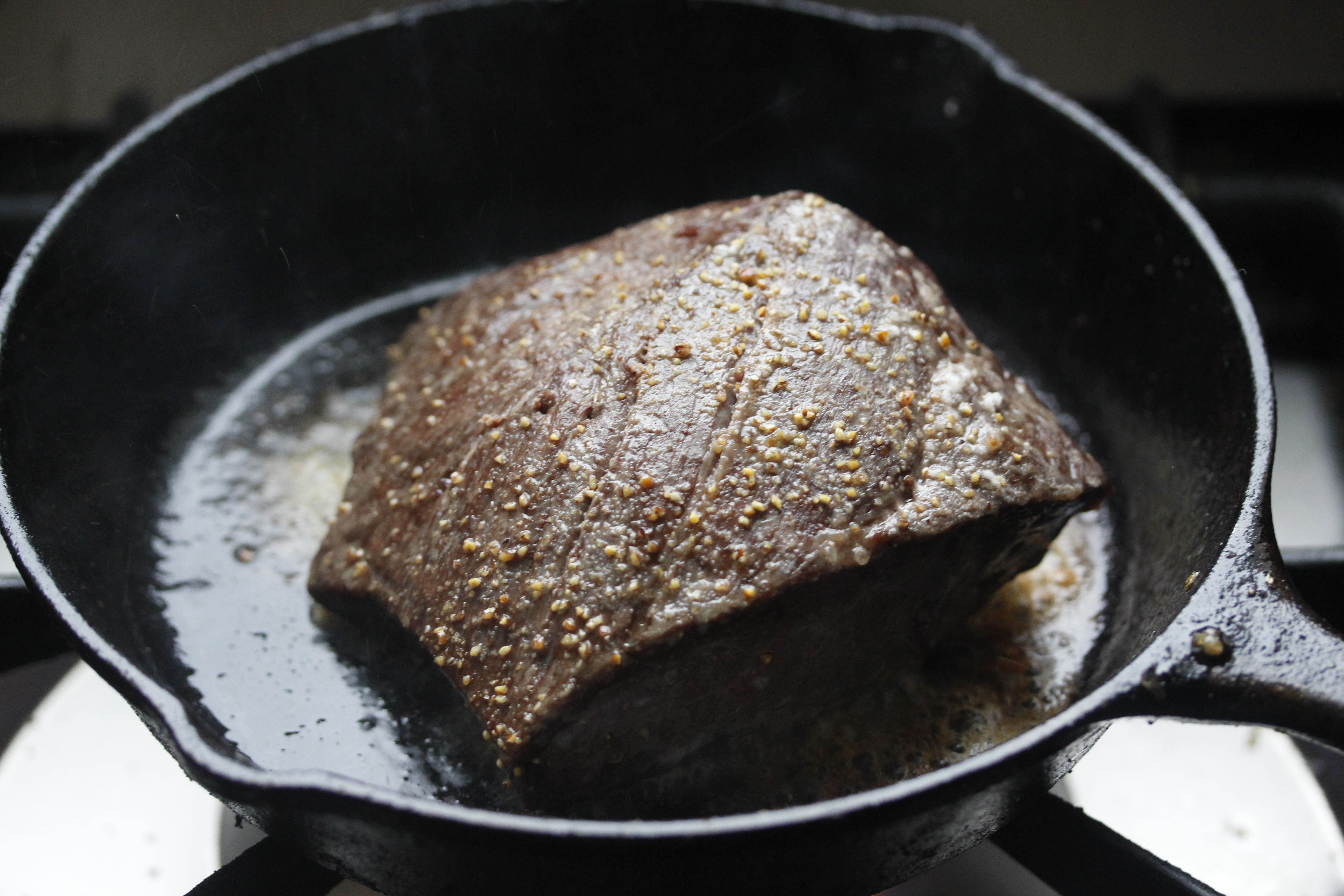 Ég hitaði svo litla pönnu, setti svolítið af olíu og smjöri á hana og brúnaði kjötið vel við góðan hita á annarri hliðinni …