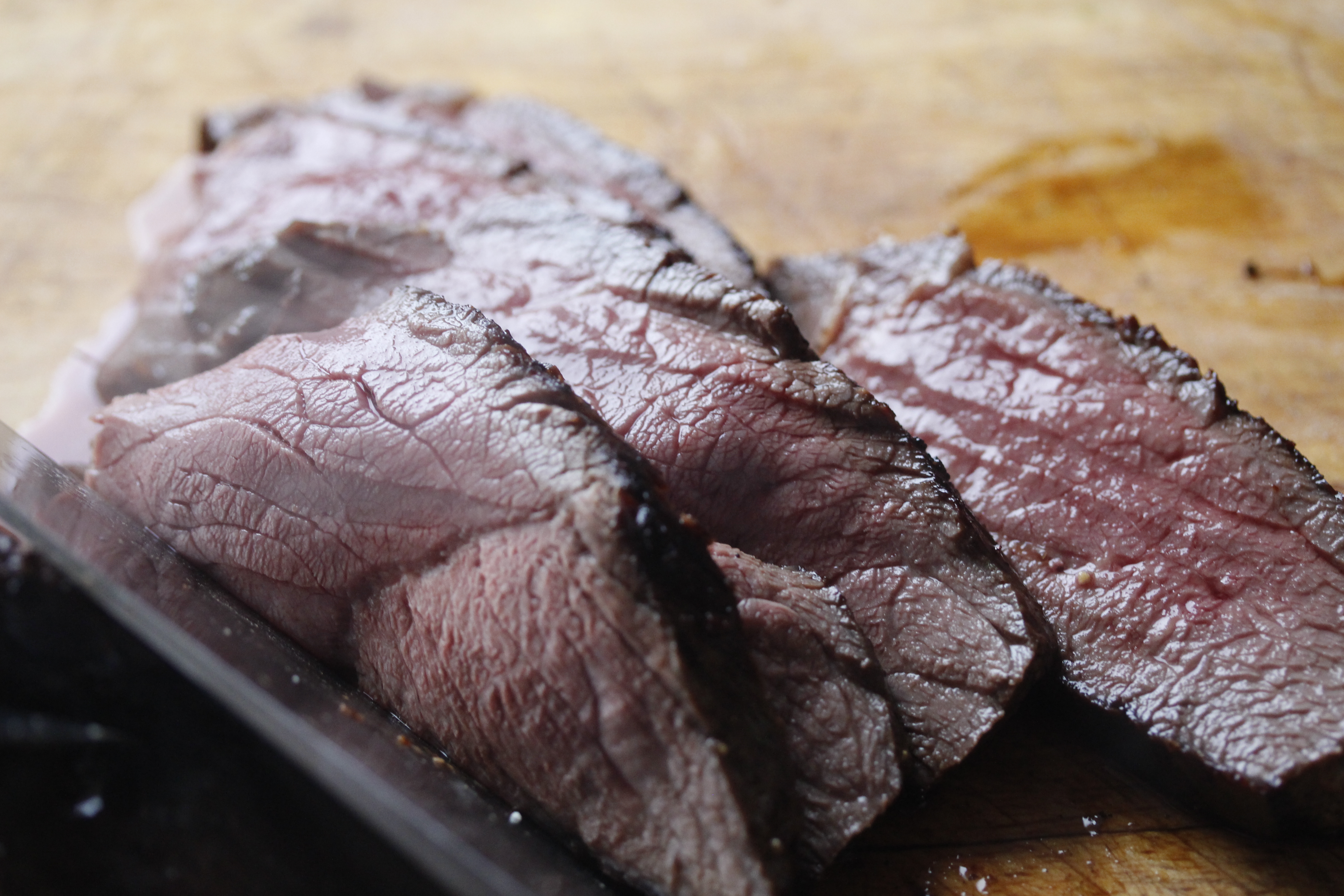 Venjulega er mikilvægt að láta steik bíða að lokinni eldamennsku, áður en hún er skorin, til að steikingin jafni sig og safinn dreifist um kjötið en streymi ekki úr því þegar skorið er í það. En þessi steik var búin að bíða áður en hún var brúnuð svo það var óþarfi og ég skar hana um leið og hún kom af pönnunni, í þunnar sneiðar þvert á vöðvaþræðina. Eins og sést er kjötið allt jafnbleikt í gegn og verulega safaríkt. Og safinn er tær en ekki bleikur – ef ykkur er illa við ,,blóð“ (en bleiki safinn sem rennur úr kjöti sem ekki er ofsteikt er ekki blóð).