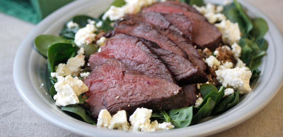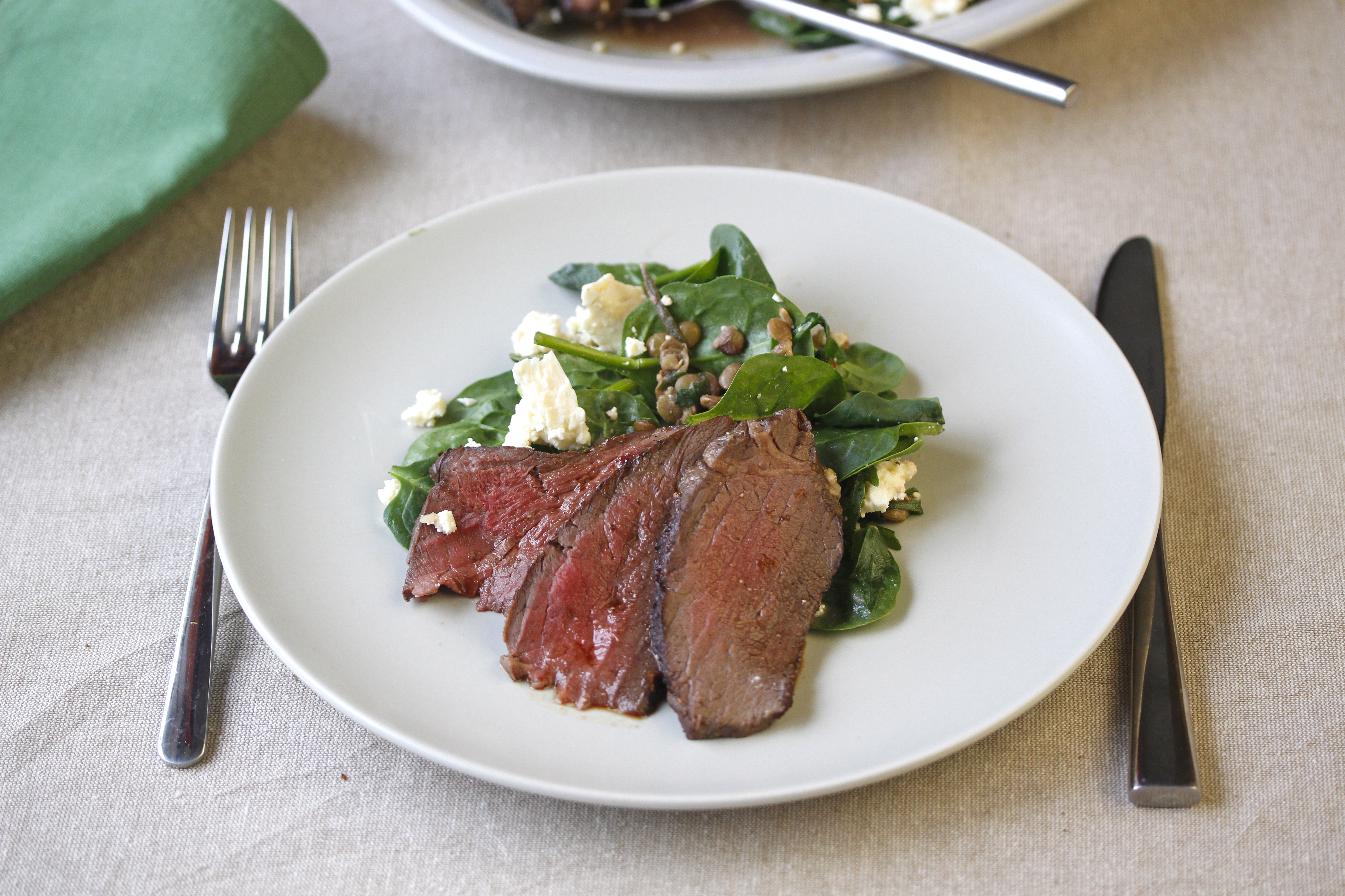 Það er hægt að hafa ýmiss konar salöt og meðlæti með þessu en ég átti afgang af grænum linsubaunum – svona 50-70 g – og blandaði þeim saman við væna hrúgu af spínatblöðum. Hristi saman 2 msk af ólífuolíu, 2 tsk af sítrónusafa, pipar og salt, hellti yfir og blandaði. Svo dreifði ég þessu á lítið fat, raðaði kjötsneiðunum ofan á og muldi 50-60 g af fetaosti (kubbi) í kring og grófmuldi líka 4-5 valhnetur og stráði í kring.