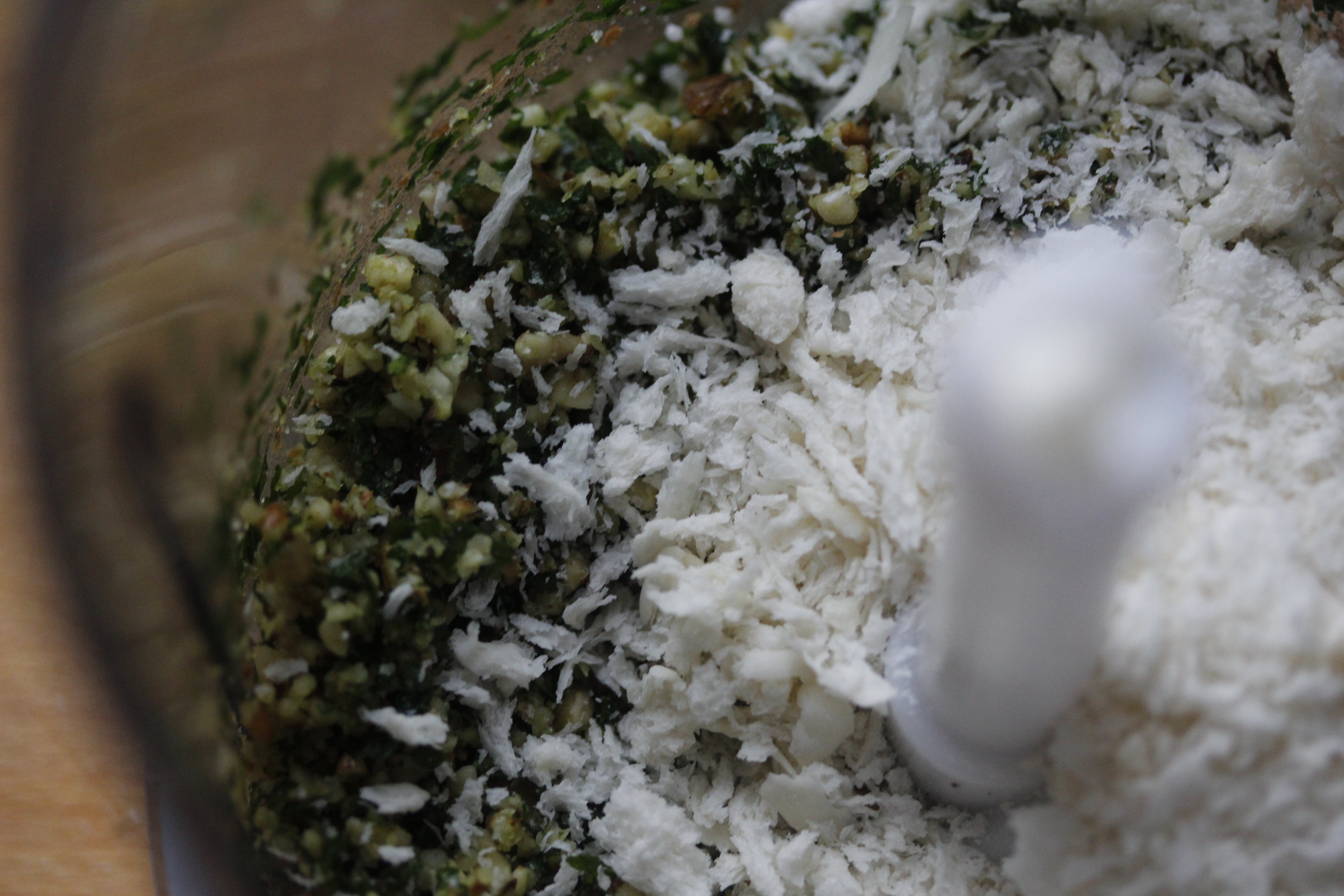 Ég setti svo 25 g af valhnetum (eða pekanhnetum), 1/2 knippi af steinselju, rifinn börk af 1 sítrónu og svolítinn pipar og salt í matvinnsluvél (eða blandara) og lét ganga þar til komin var gróf mylsna.