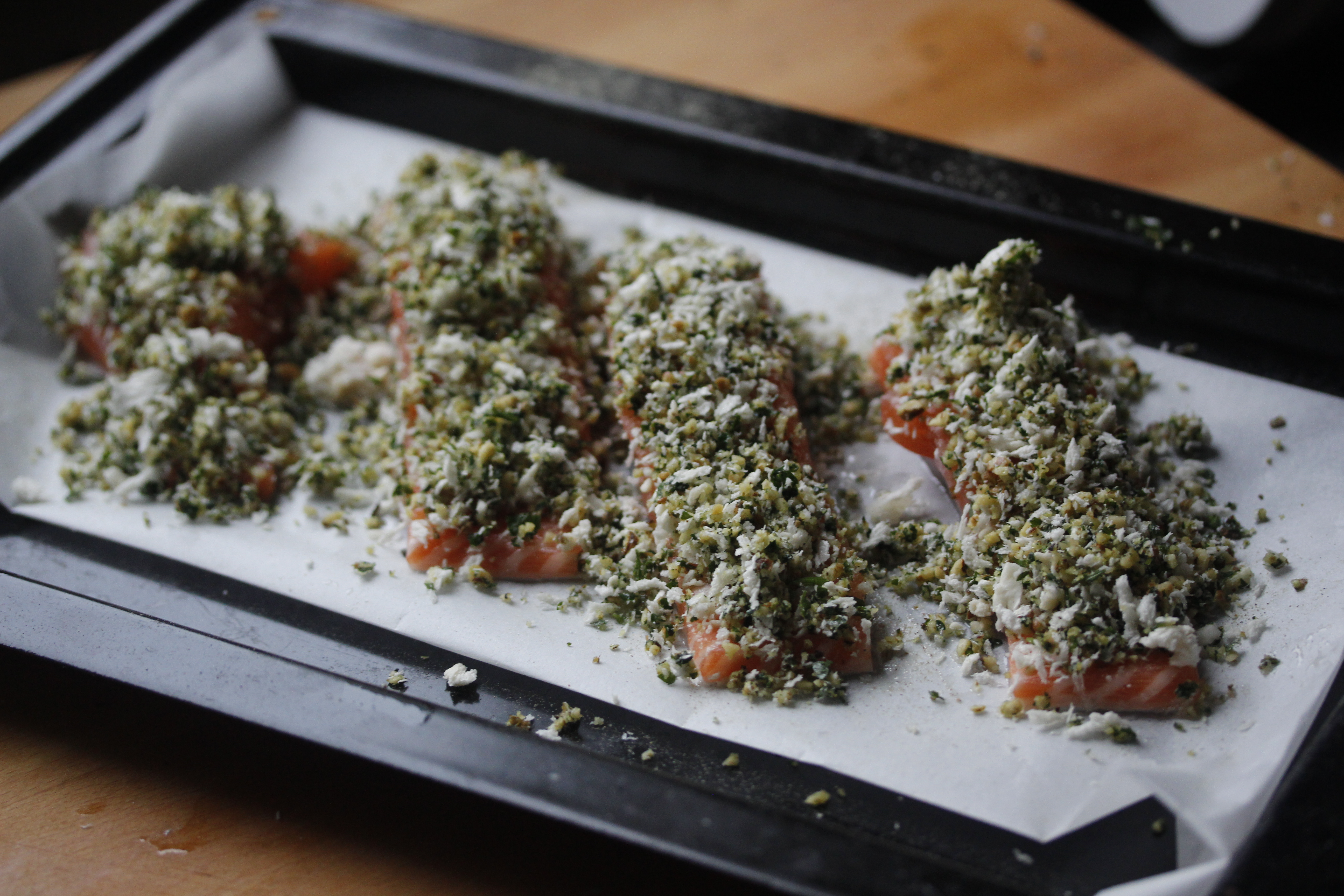 Ég var með laxaflak, svona 600-700 g. Ég skar það í 4−5 cm sneiðar þvert yfir, penslaði þær með svolítilli olíu og kryddaðu með pipar og salti. Raðaði þeim svo á pappírsklædda bökunarplötu, dreifði raspblöndunni jafnt á laxasneiðarnar og þrýsti létt niður til að raspið loddi betur við.