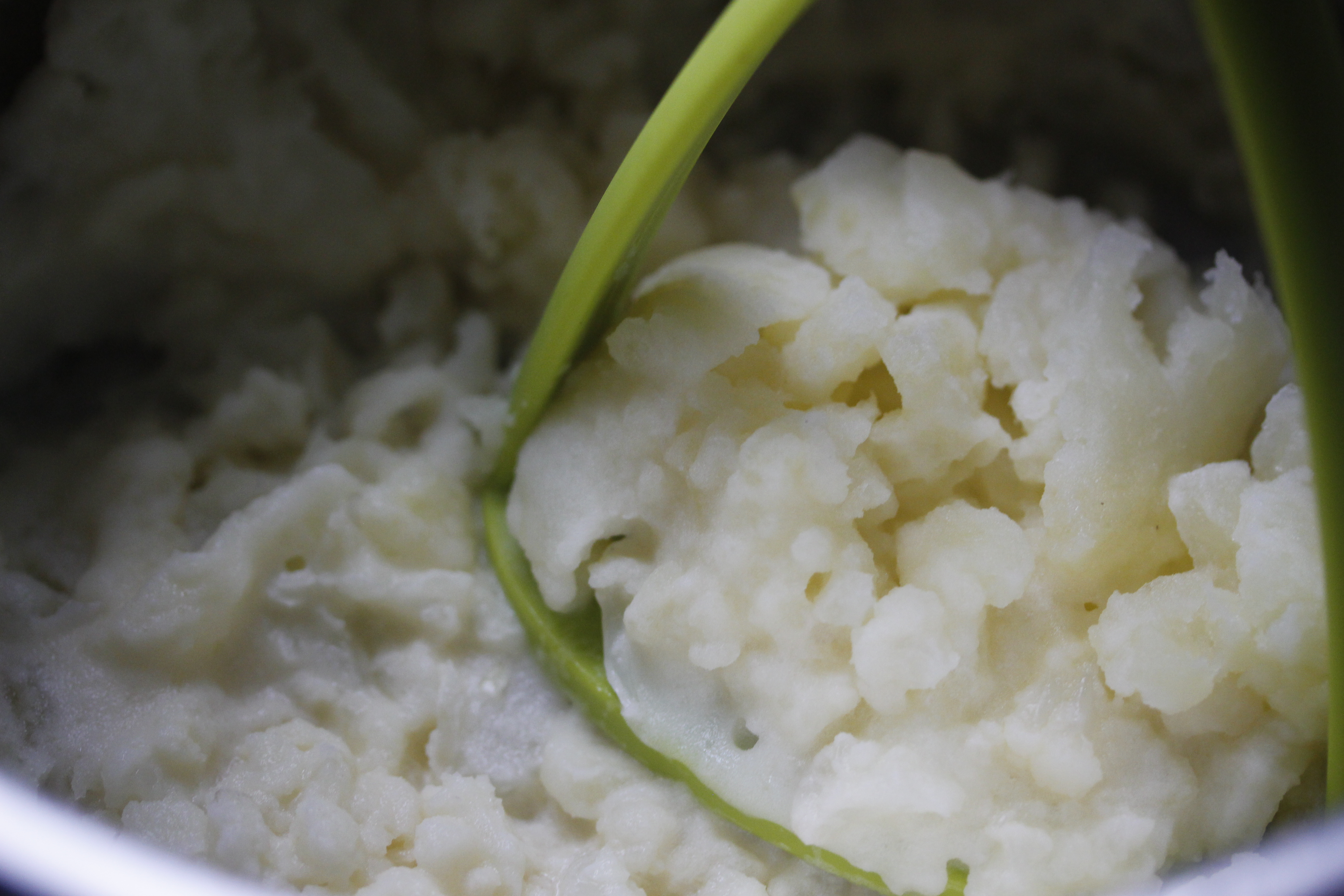 Á meðan gerði ég stöppuna: Hellti vatninu af kartöflunum og blómkálinu þegar það var tilbúið. Setti svo 50 g af smjöri út í og stappaði þetta saman.
