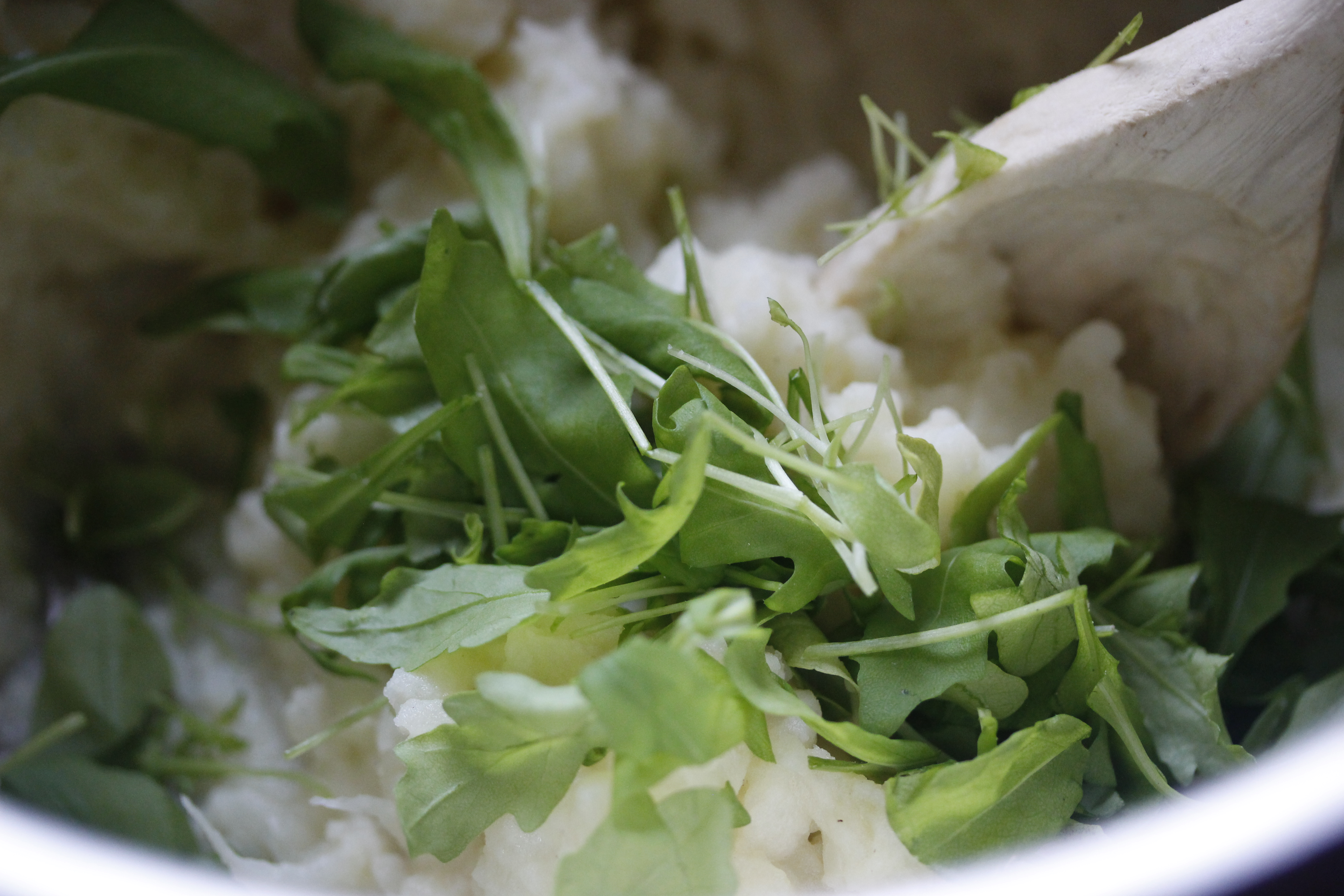 Kryddaði stöppuna með pipar og salti eftir smekk og svo blandaði ég lófafylli af grófsöxuðu klettasalati saman við. Það mætti líka nota nokkur basilíkublöð eða sleppa þessu alveg.