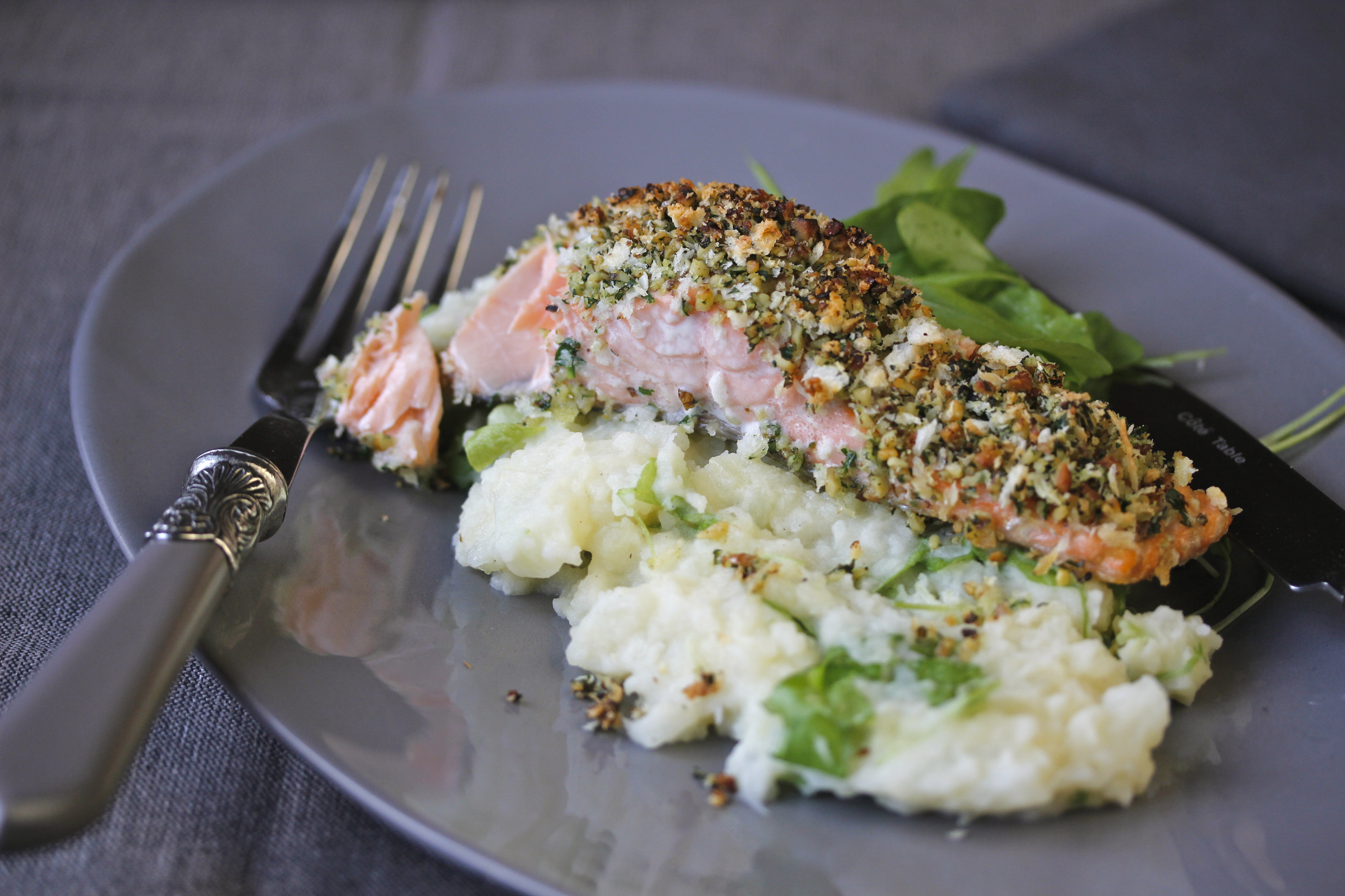 Til dæmis verð ég meira og meira fyrir fisk með árunum eins og ég hef áður sagt frá og hann er æ oftar á borðum hjá mér. Og hér kemur uppskrift, sem reyndar birtist fyrst í MAN – lax með hneturaspi og blómkáls-kartöflustöppu. Þeir sem eru glútenlausir geta þá tekið út brauðraspið og notað kannski bara hnetur og þeir sem eru á LKL geta notað eitthvað annað í staðinn fyrir kartöflurnar, kannski bara meira blómkál. Annars er glútenlaust svo 2014 og LKL svo 2013, er það ekki? Nú er það sykurleysið sem gildir …