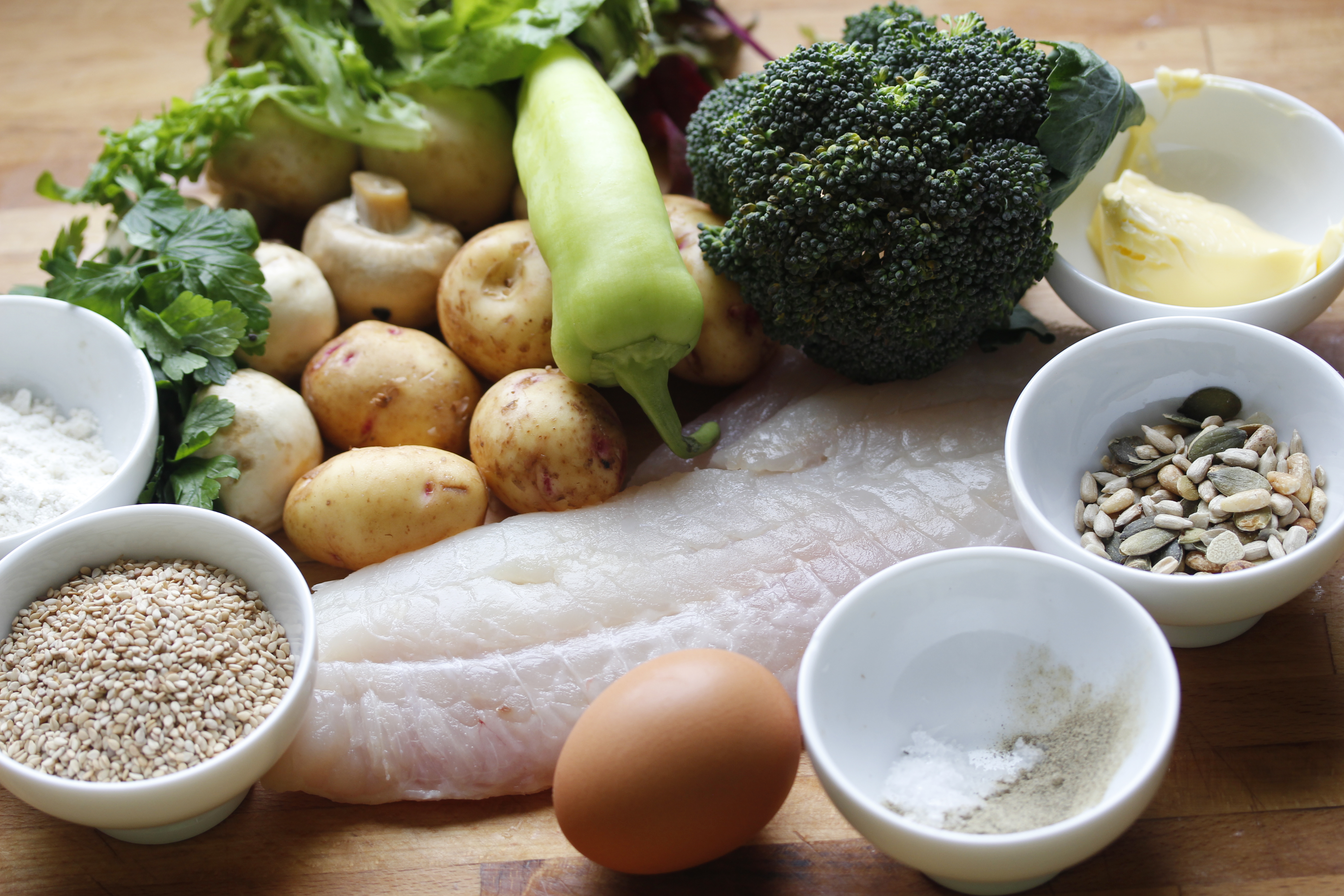 Allavega, ég tók til það sem ég ætlaði að nota. Sem var um 350 g karfaflak (þetta er uppskrift fyrir tvo), 5 msk af sesamfræjum, 2 msk af hveiti (ég hefði notað heilhveiti en það var búið svo ég notaði venjulegt), 250 g af kartöflum, frekar litlum (og ég eldaði þetta reyndar í haust svo þær voru nýuppteknar), 100 g af sveppum, 100 g af spergilkáli, 1/2 milt chilialdin, væna lófafylli af blönduðum salablöðum, nokkrar steinseljugreinar, 1-2 msk af fræblöndu (eða graskersfræjum), 1 egg, 2 msk af olíu, 2 msk af smjöri, pipar og salt. Svo notaði ég sítrónu en hún er ekki á myndinni (og er ekkert nauðsynleg).