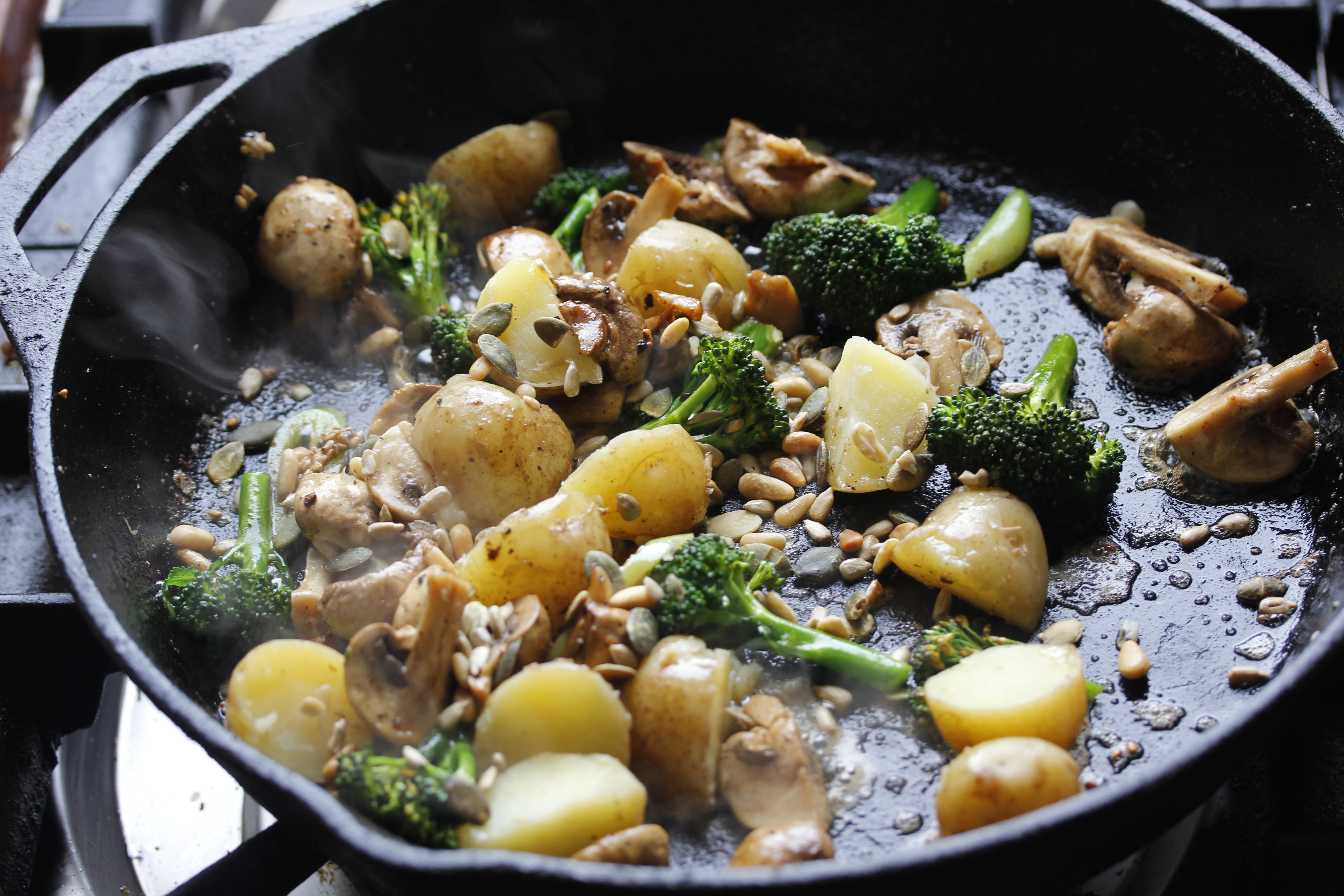 Ég byrjaði á að sjóða kartöflurnar þar til þær voru meyrar, lét þær kólna aðeins og skar þær svo í tvennt (eða smærra ef þær voru stórar). Síðan skar ég sveppina í tvennt eða fernt og skiptuispergilkálinu í litla kvisti. Fræhreinsaði chilialdinið og sneiddi það þunnt. Hitaði svo 1 msk af smjöri og 1 msk af olíu á stórri pönnu og lét sveppina, spergilkálið og chili-ið krauma í 2-3 mínútur.