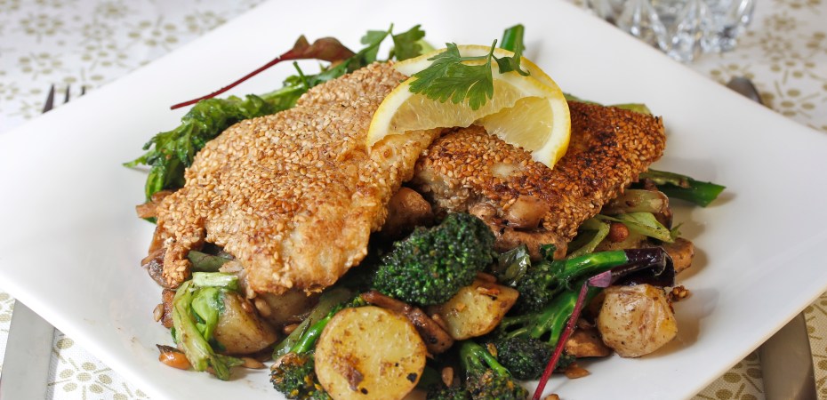Sesamhjúpaður fiskur með snöggsteiktu grænmeti