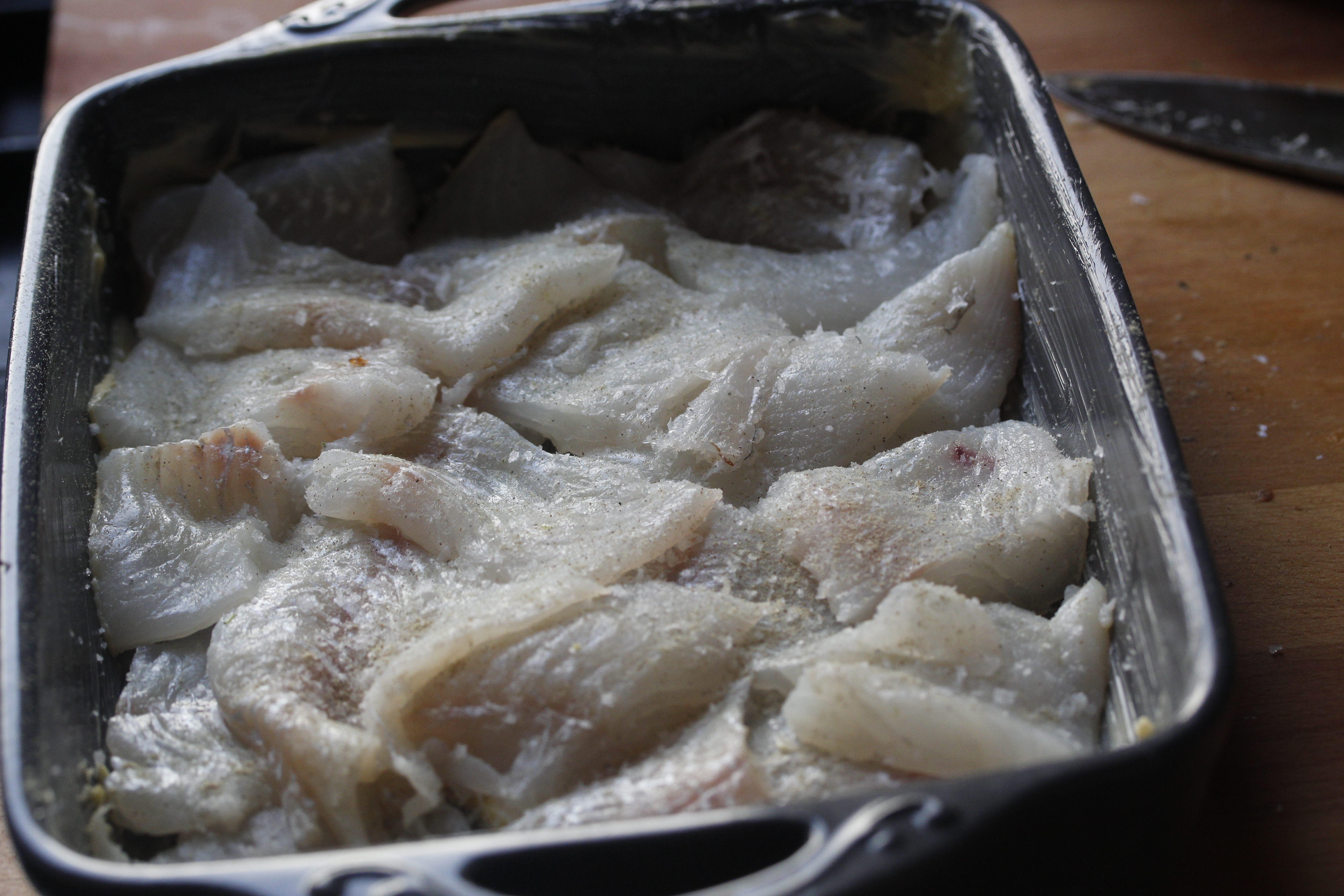 Ég skar fiskinn í bita og kryddaði með pipar og salti. Smurði eldfast mót með dálitlu smjöri, raðaði fiskbitunum í það og kryddaði með pipar og salti. Lét standa smástund og stillti ofninn á 210°C.