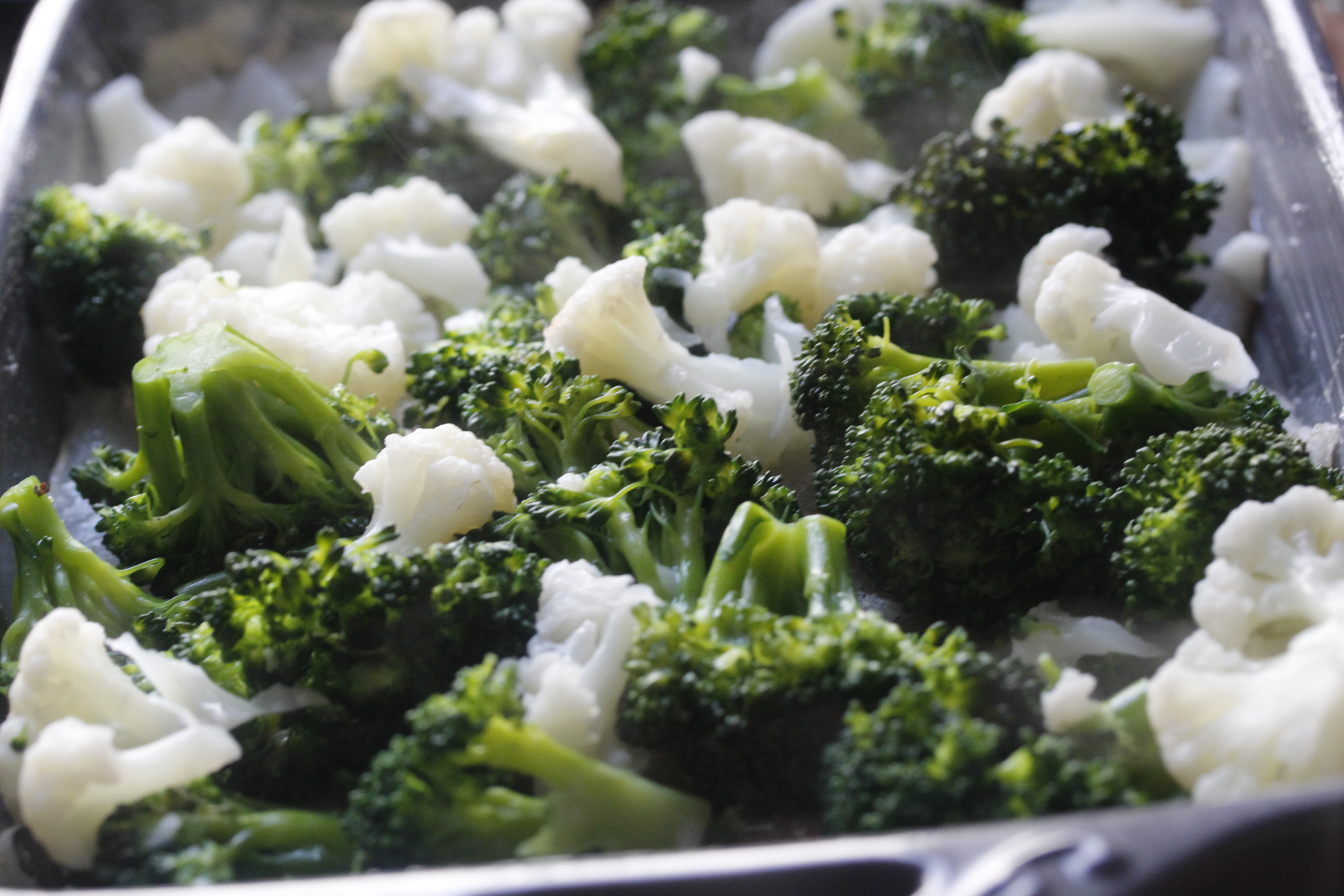 Ég deifði svo spergilkálinuog heilu blómkálskvistunum yfir fiskinn í fatinu.