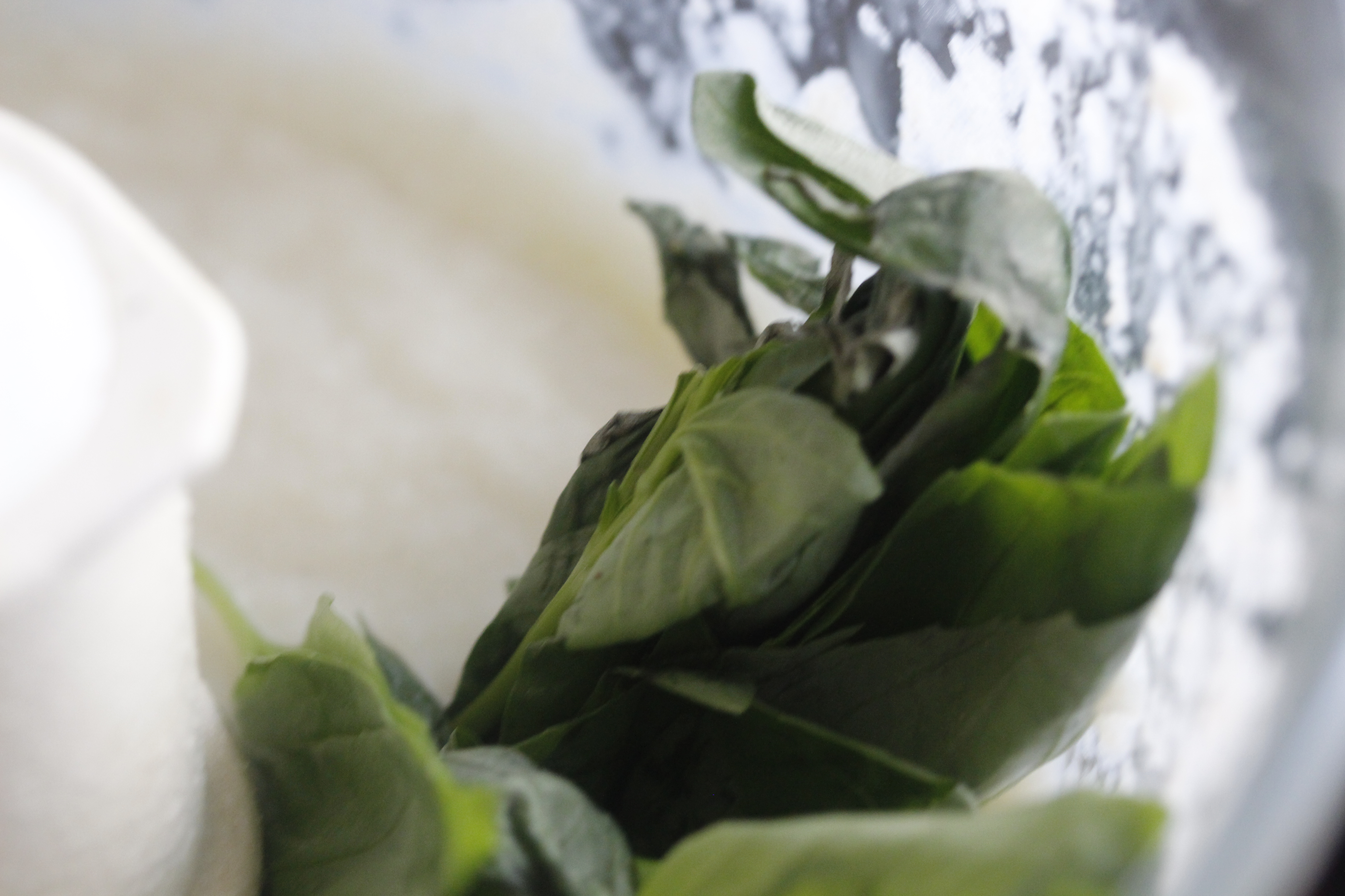 Ég snyrti á meðan blómkálið og skar stilkinn úr því. Skipti því svo í kvisti. Hitaði mjólkina í potti, setti blómkálið út í og lét það malla í 6−8 mínútur, eða þar til það var orðið meyrt. Þegar blómkálið var soðið tók ég það upp með gataspaða og tók um það bil þriðjunginn frá en setti hitt í matvinnsluvél eða blandara og maukaði það. Hellti heitri mjólkinni smátt og smátt saman við, þar til maukið er orðið á þykkt við uppstúf. Þá kryddaði ég það með pipar og salti eftir smekk og maukaði nokkur basilíkublöð saman við af því að ég átti þau. Það mætti líka nota aðrar kryddjurtir eða sleppa þeim alveg.