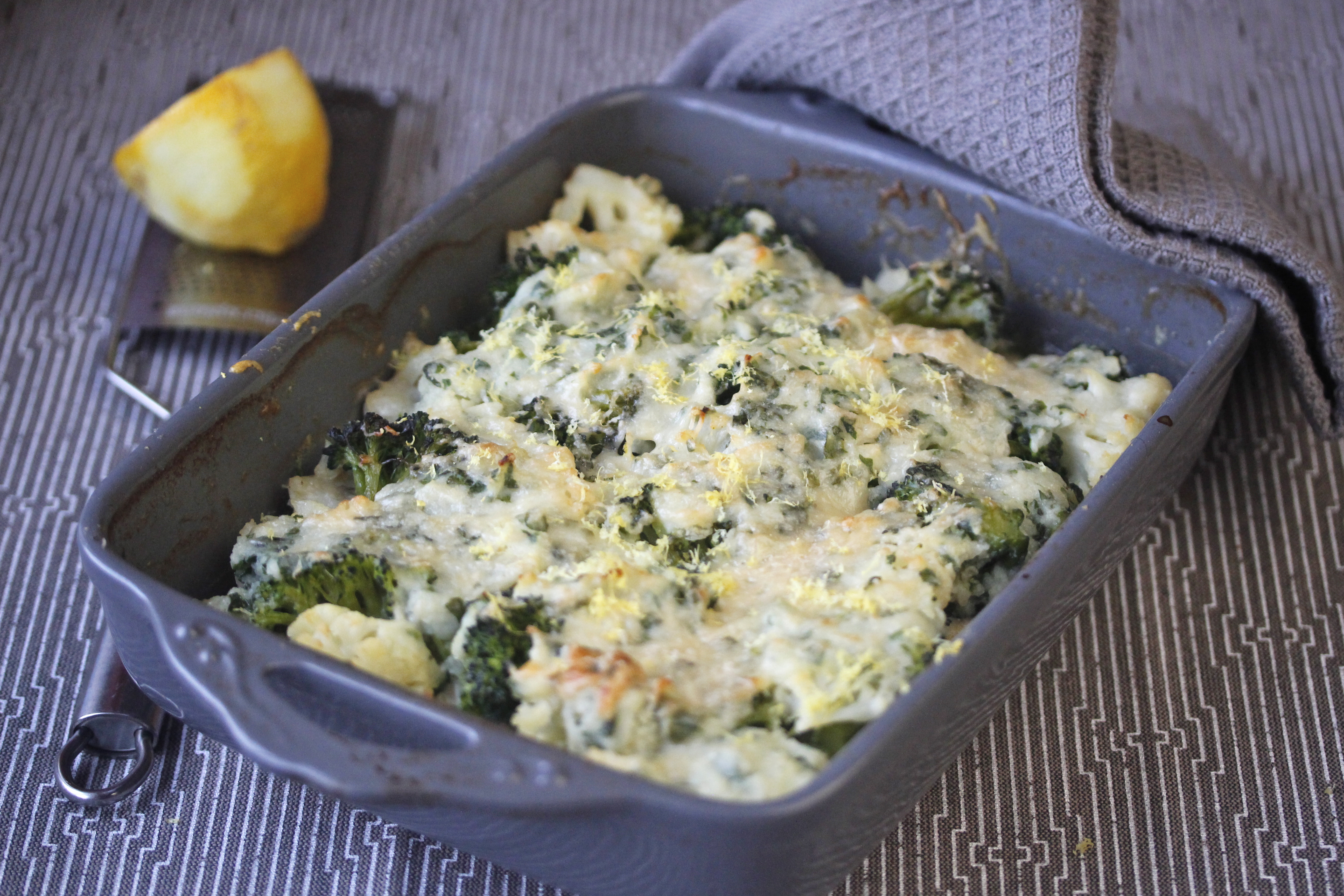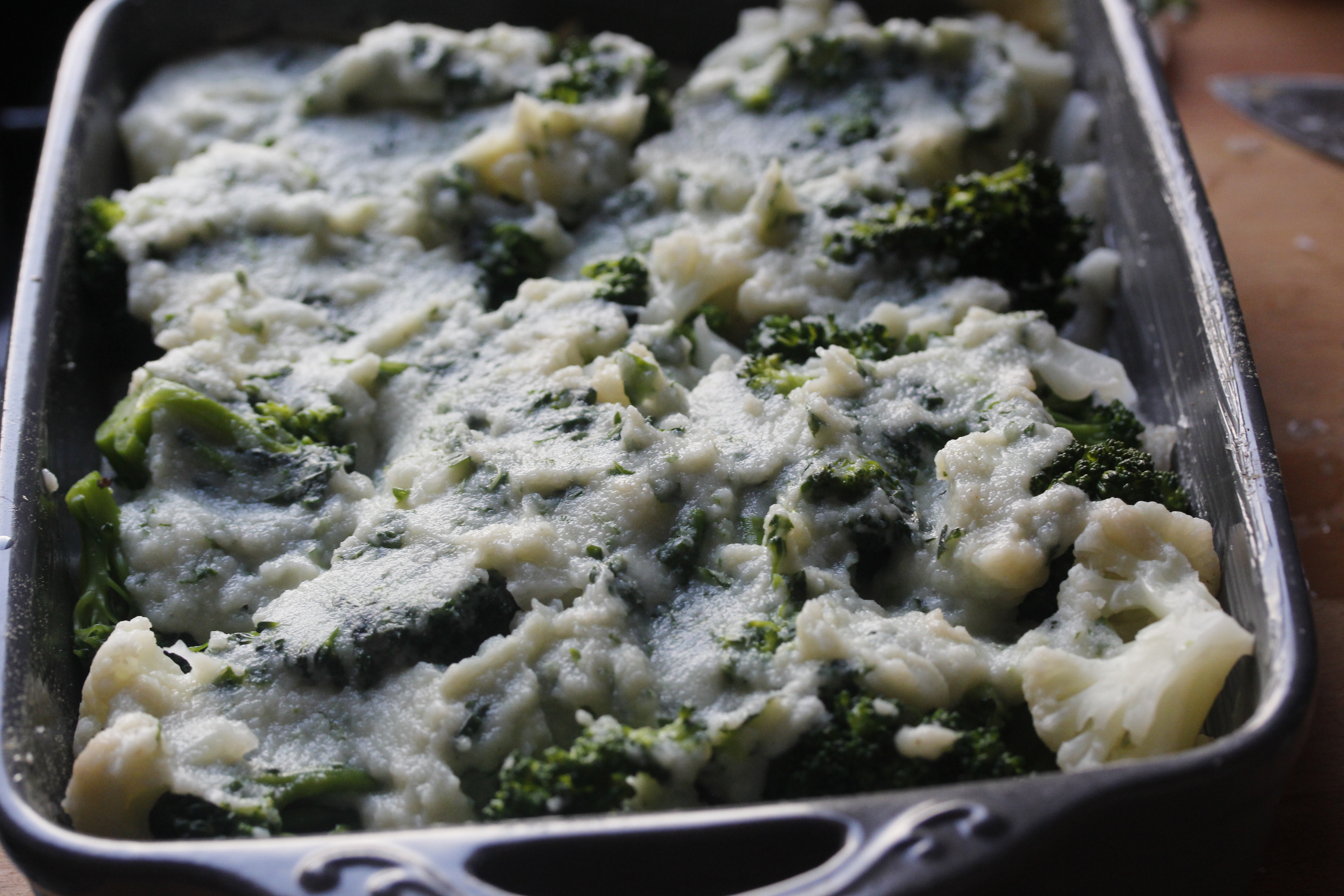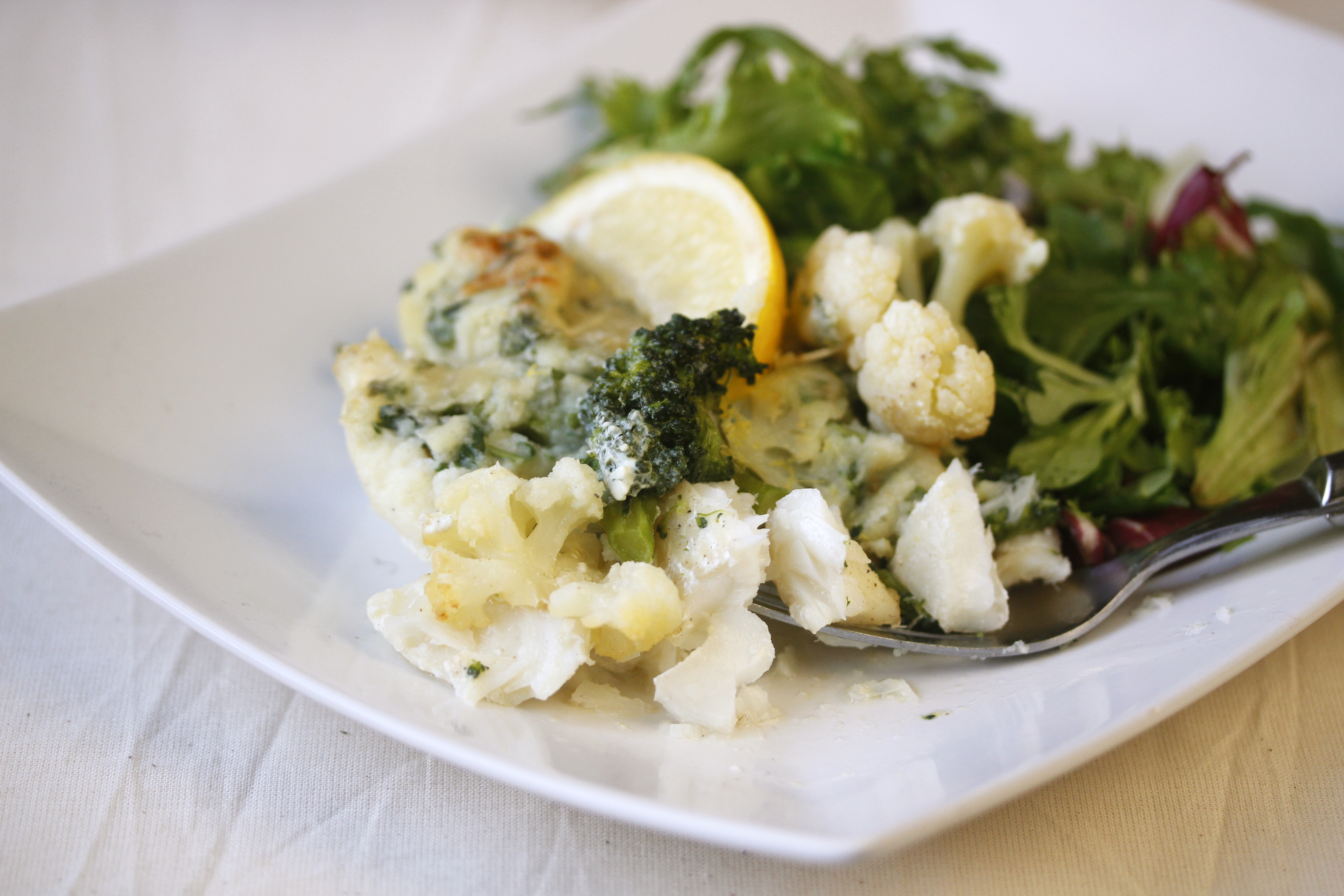 Gratíneraður fiskur með spergilkáli og blómkáli