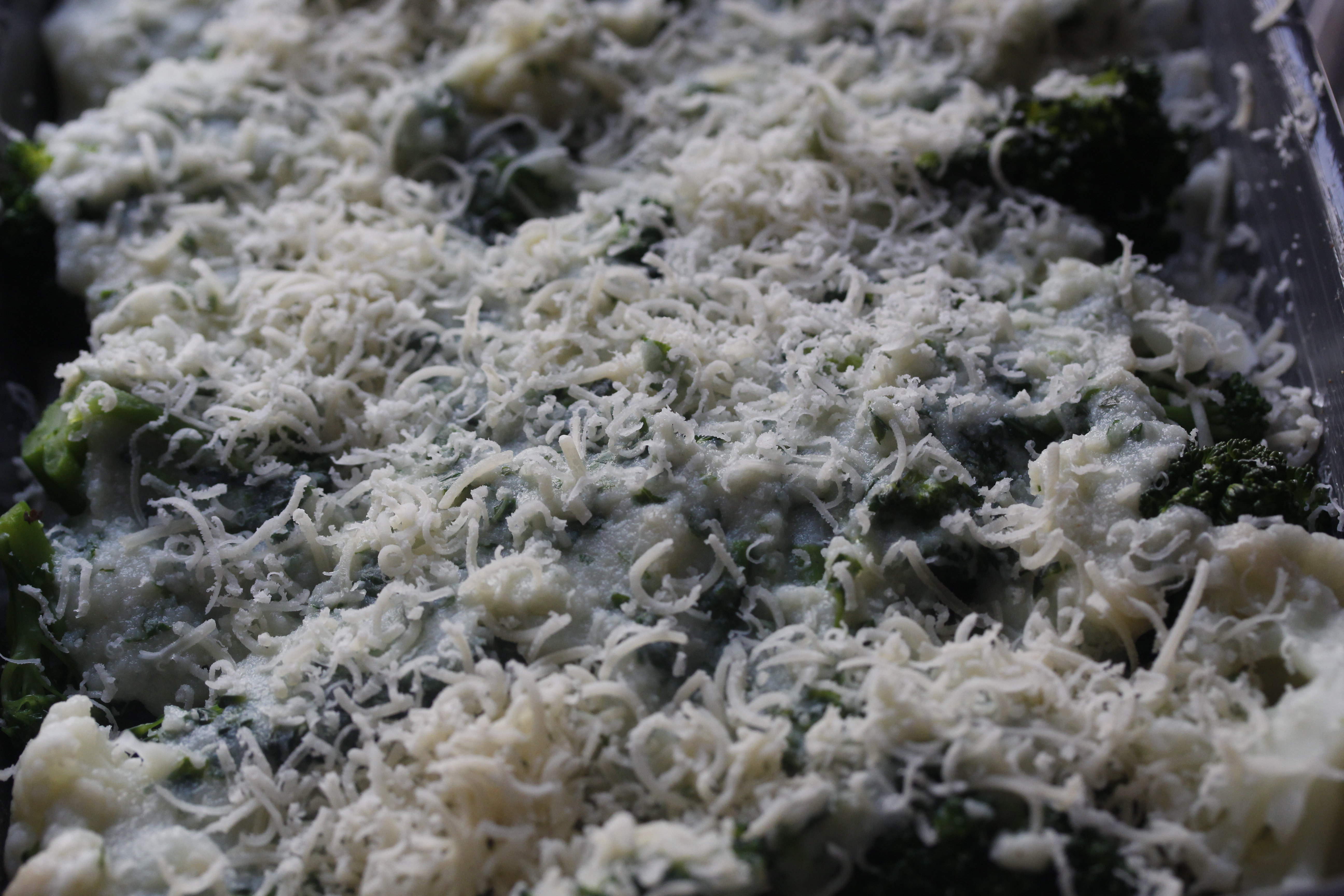 Ég var semsagt með (fyrir 4) svona 600 g af litlum ýsuflökum – en það má nota hvaða hvítan fisk sem er, t.d. þorsk eða steinbít – 400-500 g af blómkáli, 150 g af spergilkáli, 300 ml af mjólk, pipar, salt, fáein basilíkublöð (má sleppa), 25 g af parmesanosti og smjör til að smyrja formið með.
