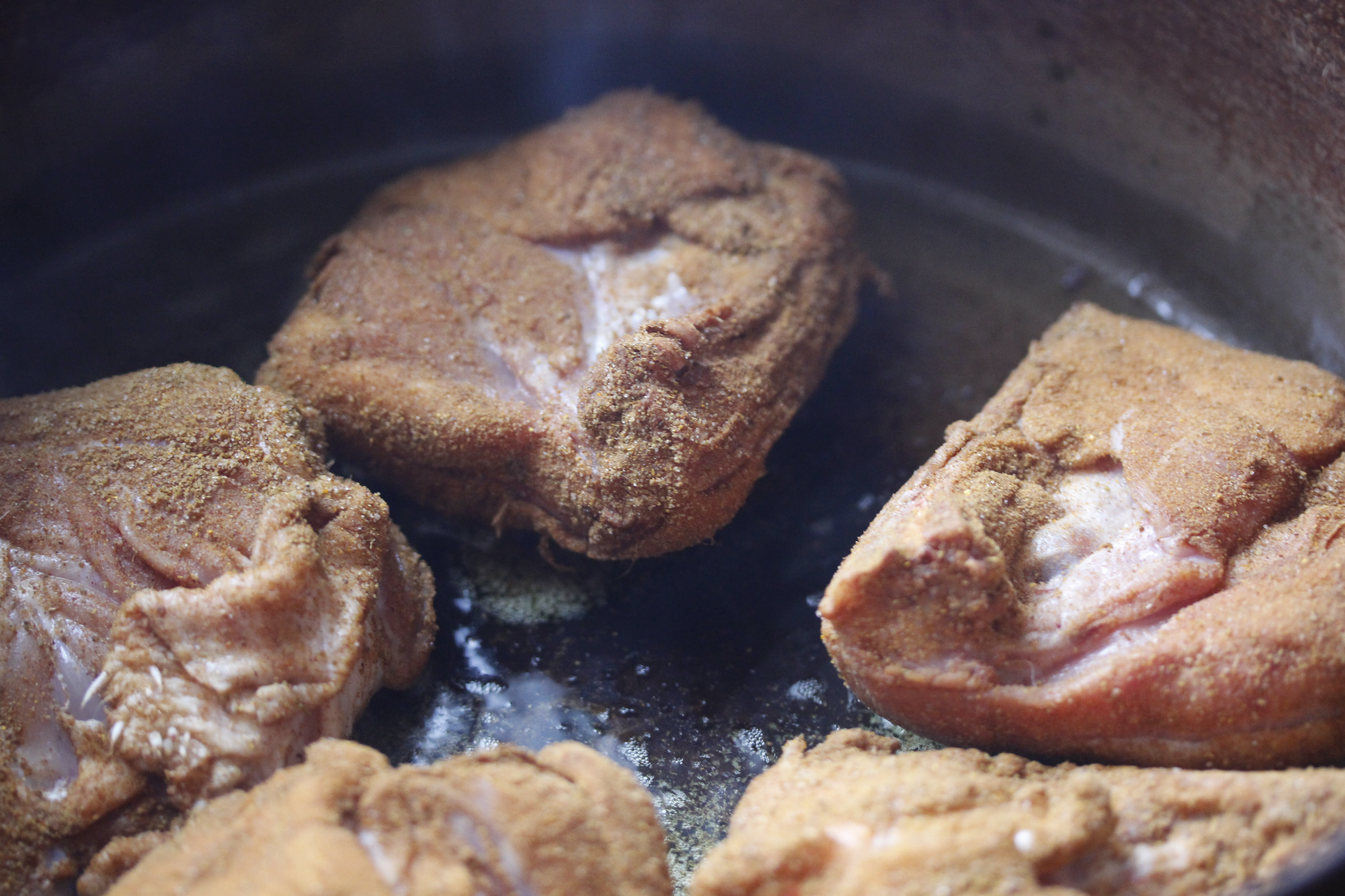 Svo setti ég lærin í pokann og velti fram og aftur þar til þau voru þakin kryddi. Hitaði síðan 4 msk af olíu í stórum, þykkbotna potti …
