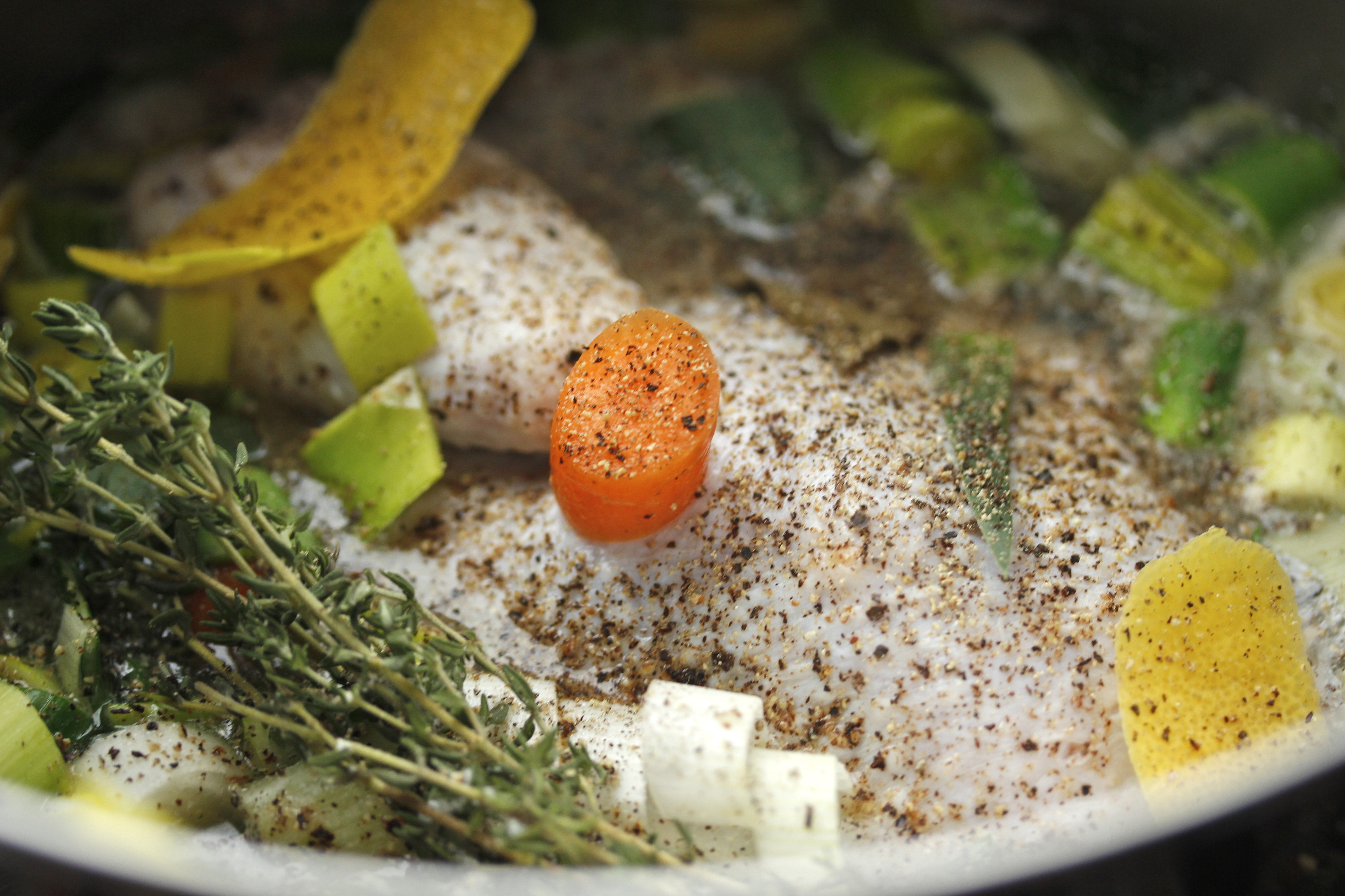 Svo skar ég niður 1 meðalstóran blaðlauk, 150 g af gulrótum og 2 sellerístöngla. Saxaði 2 hvítlauksgeira smátt og skar ræmur af gula berkinum af 1 sítrónu. Setti þetta allt í pottinn, ásamt 2-3 lárviðarlaufum og nokkrum timjangreinum (eða 1/2-1 tsk af þurrkuðu timjani).