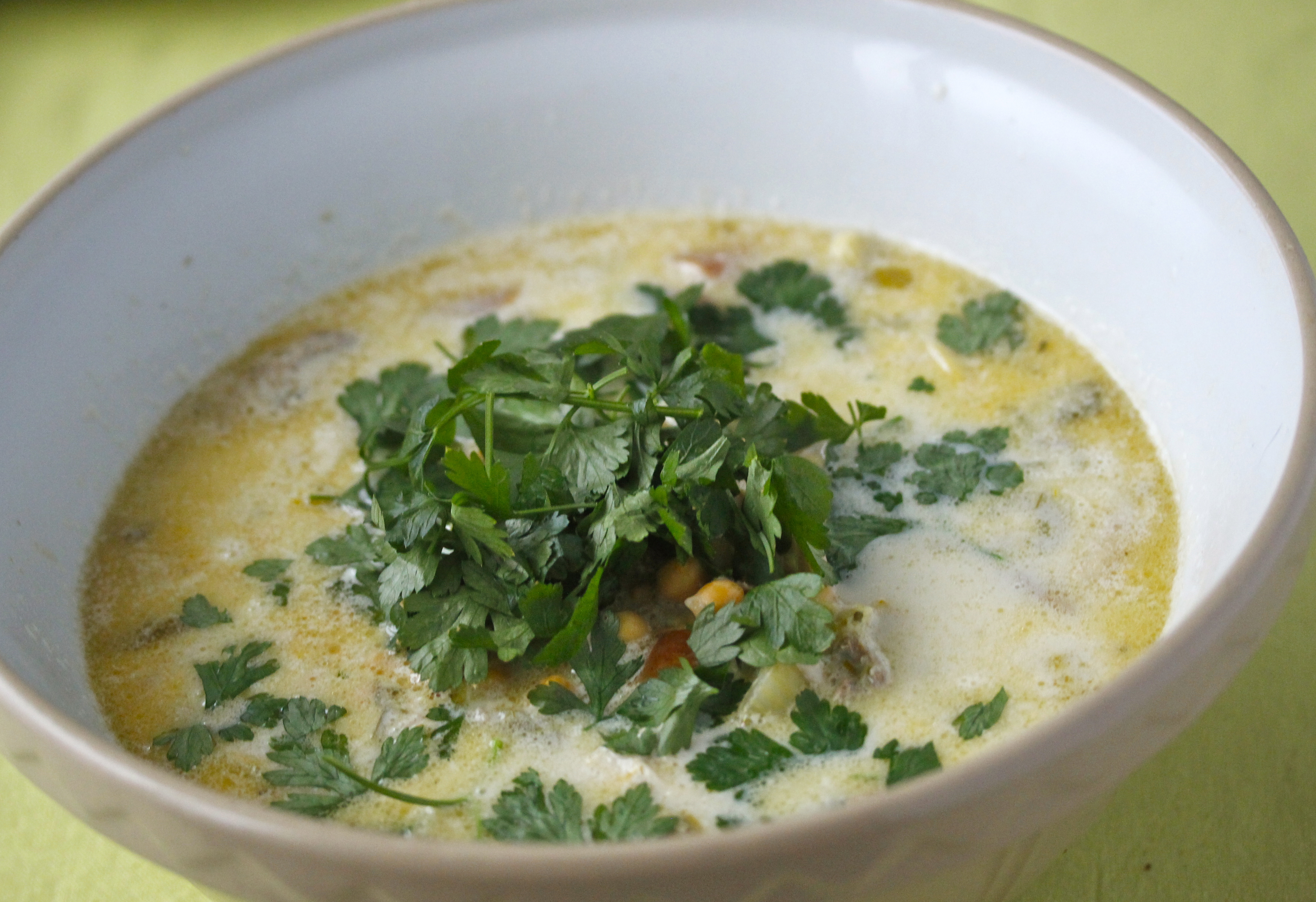 Ég ákvað að bæta við baunum til að gera súpuna að fullkominni máltíð (hefði auðvitað líka getað notað allt kjötið af hænunni en mig langaði að hafa baunir) svo að ég hellti vökvanum af 1 dós af kjúklingabaunum, setti baunirnar út í súpuna og lét malla í nokkrar mínútur, þar til hænan og baunirnar voru heit í gegn. Ég átti smáskvettu af rjóma, svona 100 ml, og ákvað að setja hann út í en það er ekkert nauðsynlegt. Það mætti líka nota kókosmjólk.