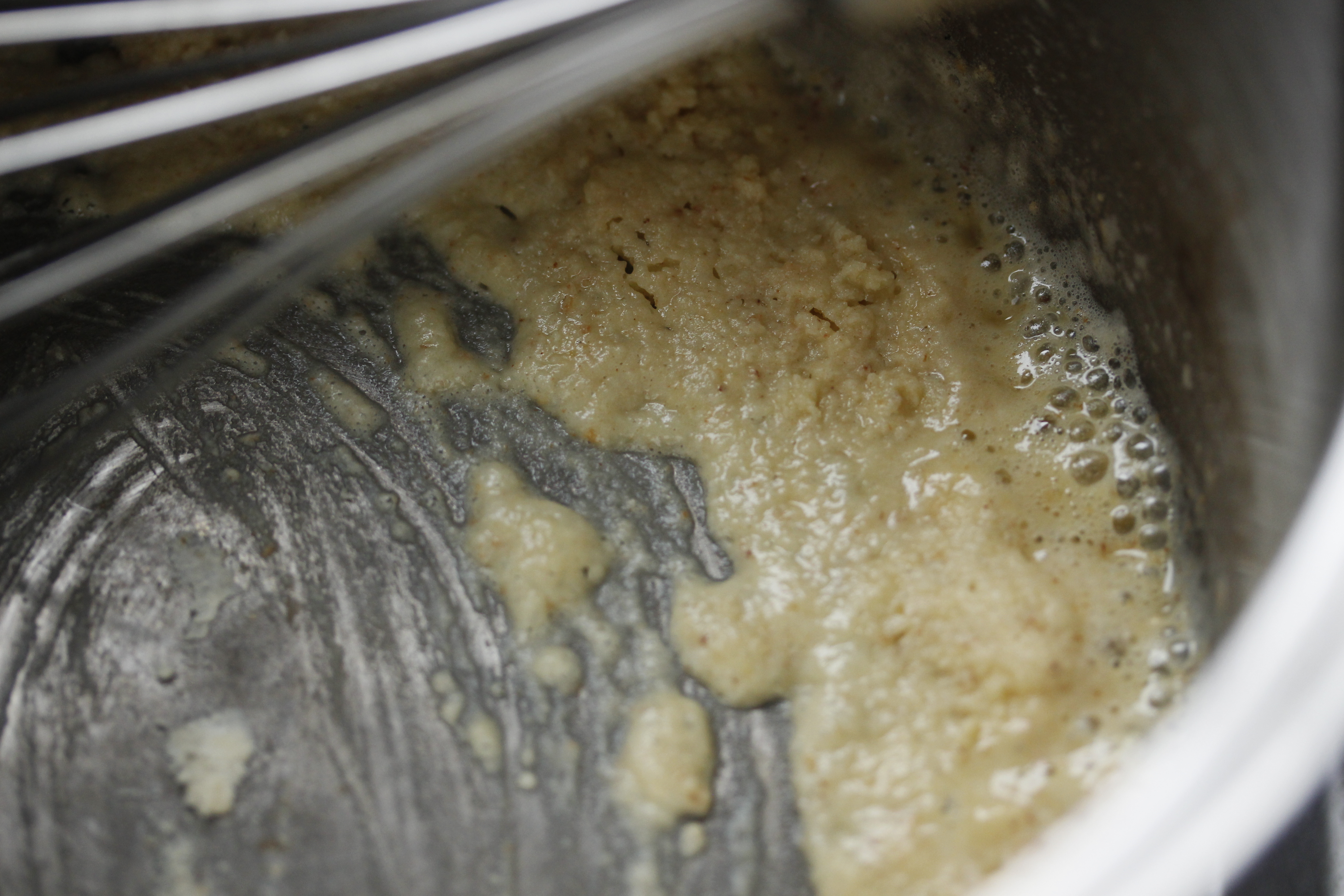En allavega, ég hellti hænsnasoði smátt og smátt út í og hrærði stöðugt á meðan, þar til sósan var hæfilega þykk og alveg slétt. Ætli ég hafi ekki notað svona 300 ml af soði.