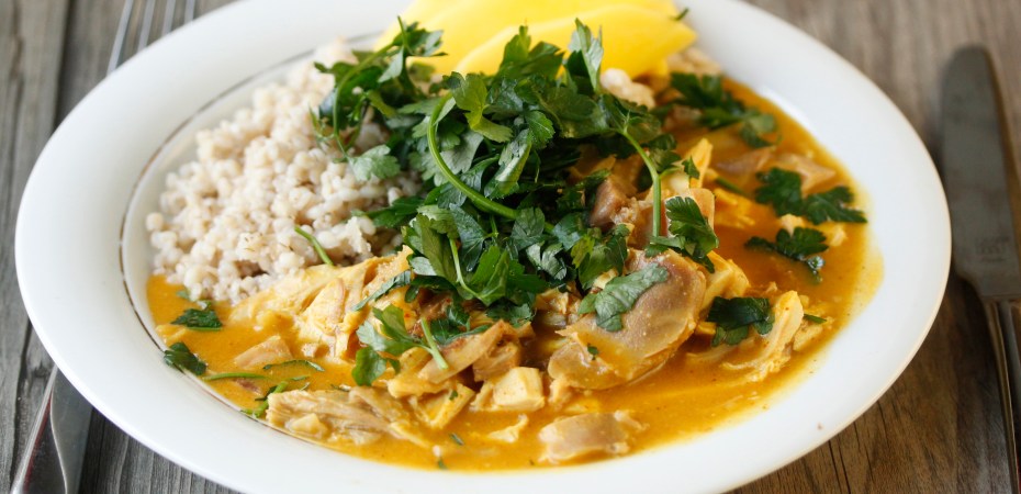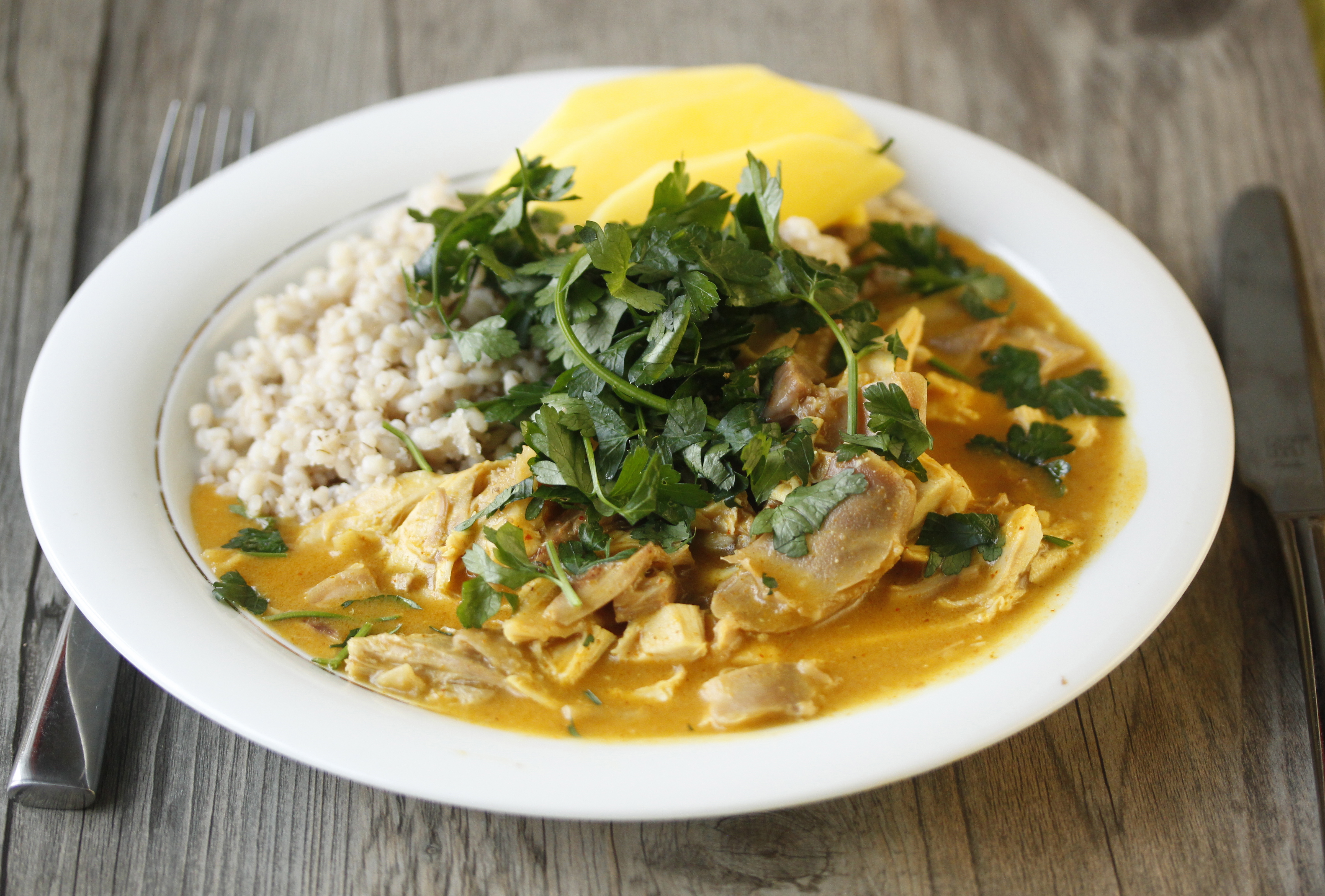 Ég geymdi hænuhelminginn og soðið í ísskápnum í tvo daga en þá var komið að því að elda úr þessu. Ég var ein í mat í þetta skipti, kom frekar seint heim úr vinnunni og hafði ekki mikinn tíma svo að ég ákvað að gera bara fljótlega og mjög einfalda karríkássu og hafa með henni soðið perlubygg (frá Vallanesi, mjög gott – en það má auðvitað líka hafa hrísgrjón eða eitthvað annað).