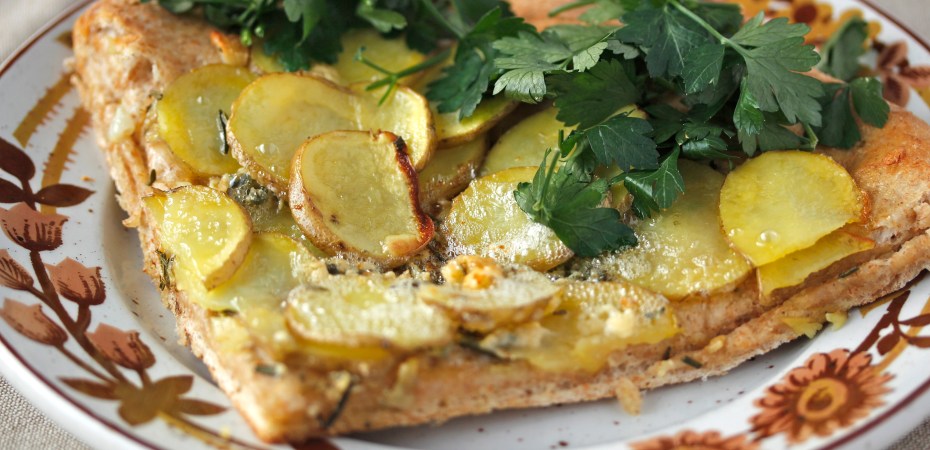 En nóg um það. Hér er kartöflupítsa með rósmaríni og gráðaosti. Kúamjólkurgráðaosti reyndar.