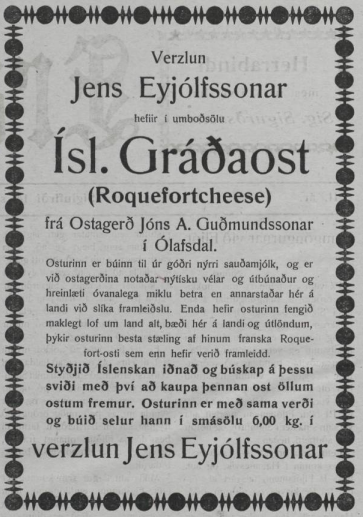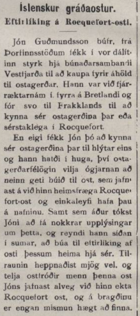Jón Ágúst Guðmundsson frá Þorfinnsstöðum í Önundarfirði var við nám í Bændaskólanum á Hvanneyri 1908-1910 og hélt síðan til Skotlands að kynna sér sauðfjárrækt. Að því loknu fór hann, hvort sem það var nú fyrirfram ákveðið eða ekki, til Frakklands að fræðast um ostagerð – nánar tiltekið til Roquefort, og þótt franskir ostagerðarmenn væru fastheldnir á leyndarmál sín tókst honum einhvern veginn að ekki bara læra að einhverju leyti aðferðir við ostagerðina, heldur náði hann líka í ekta roquefort-gerla með einhverju móti. Hér er frétt í Vestra frá 1913: