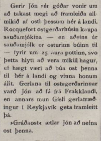 Er ekki með gögn hjá mér en Ragnhildur Torfadóttir frá Ólafsdal fór nokkuð fyrr til náms í ostgerð til Kbh og lagði sig sérstaklega eftir hvers kyns desertostum þar á meðal roquefort. Voru seldir í Reykjavík.