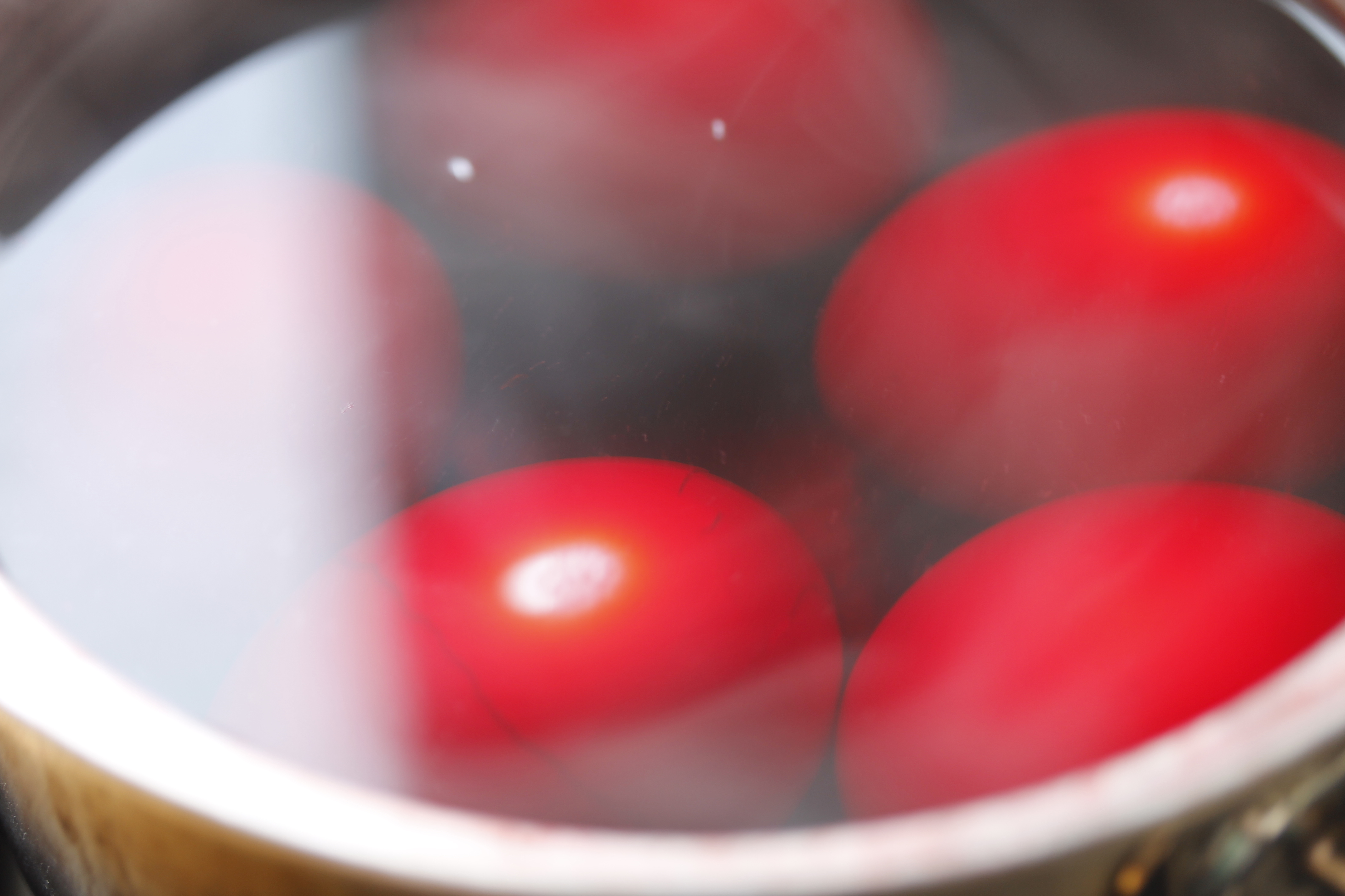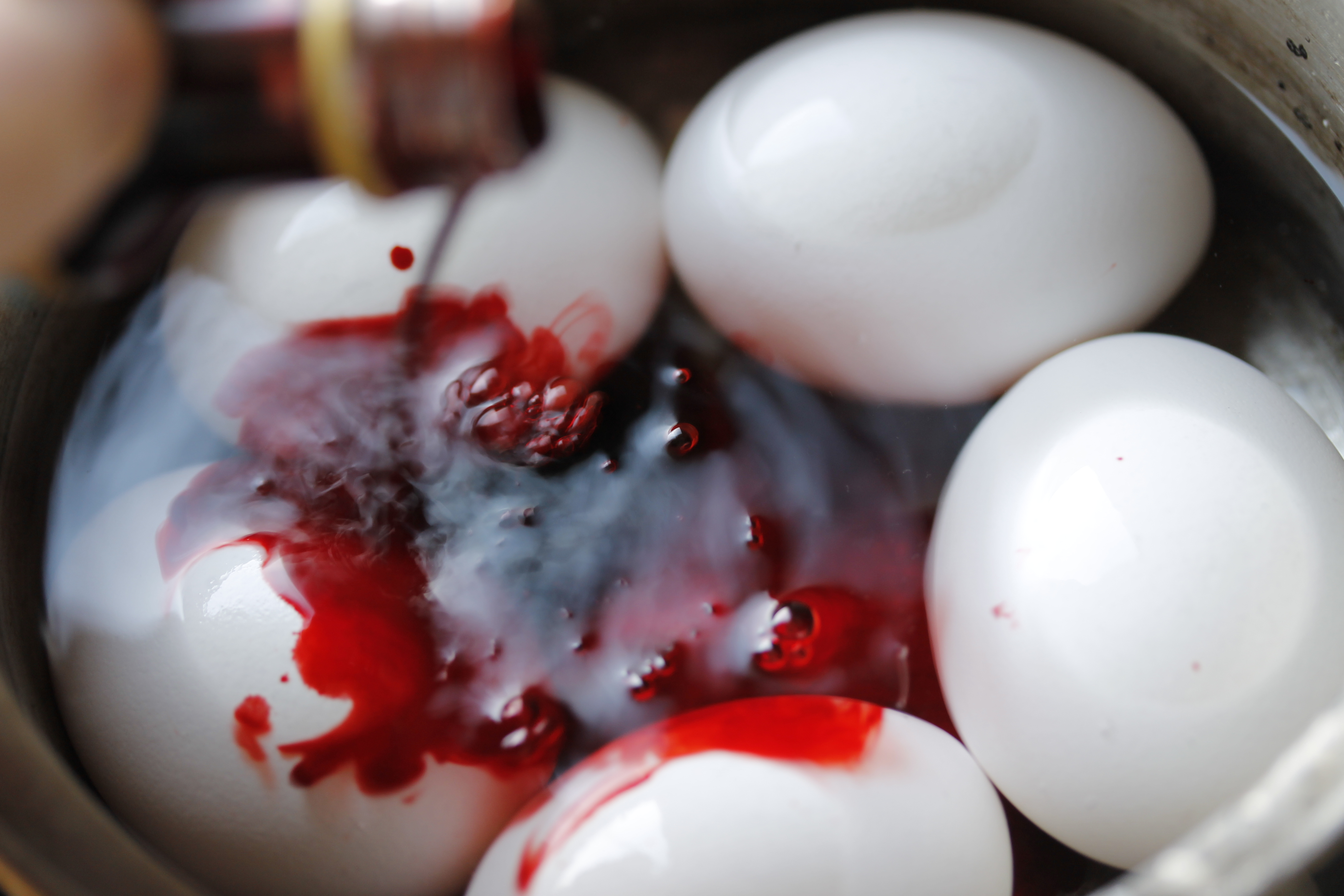 Til að lita eggin eru þau sett í pott með vatni sem rétt flýtur yfir, bætt við vænni skvettu af matarlit …