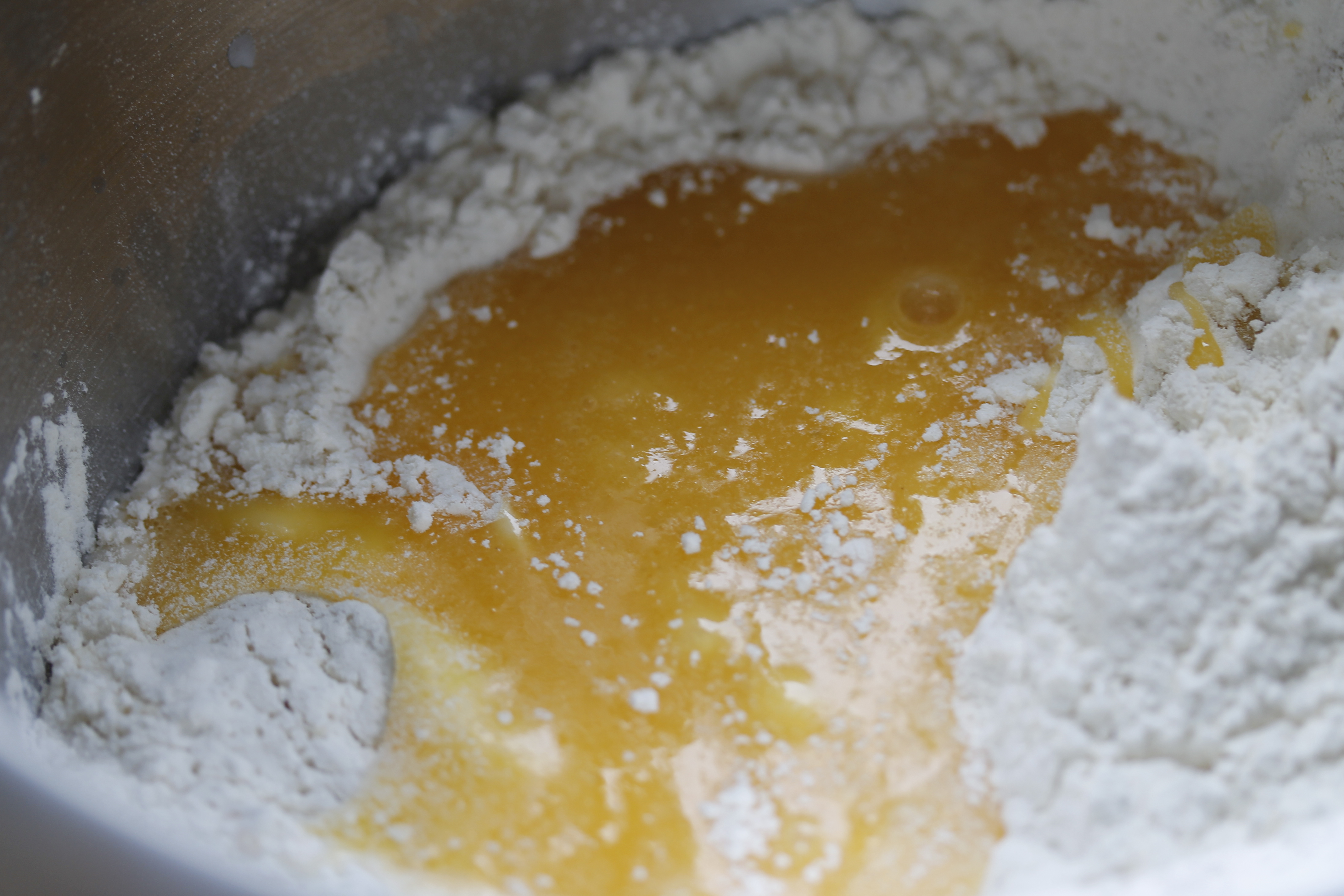 Ég bræddi svo 100 g af smjöri og lét það kólna aðeins. Braut 2 stór egg í litla skál og þeytti volgu smjörinu saman við þau. Svo setti ég hveitiblönduna og eggjablönduna í hrærivélarskálina með mjólkinni og gerinu og hrærðu saman.