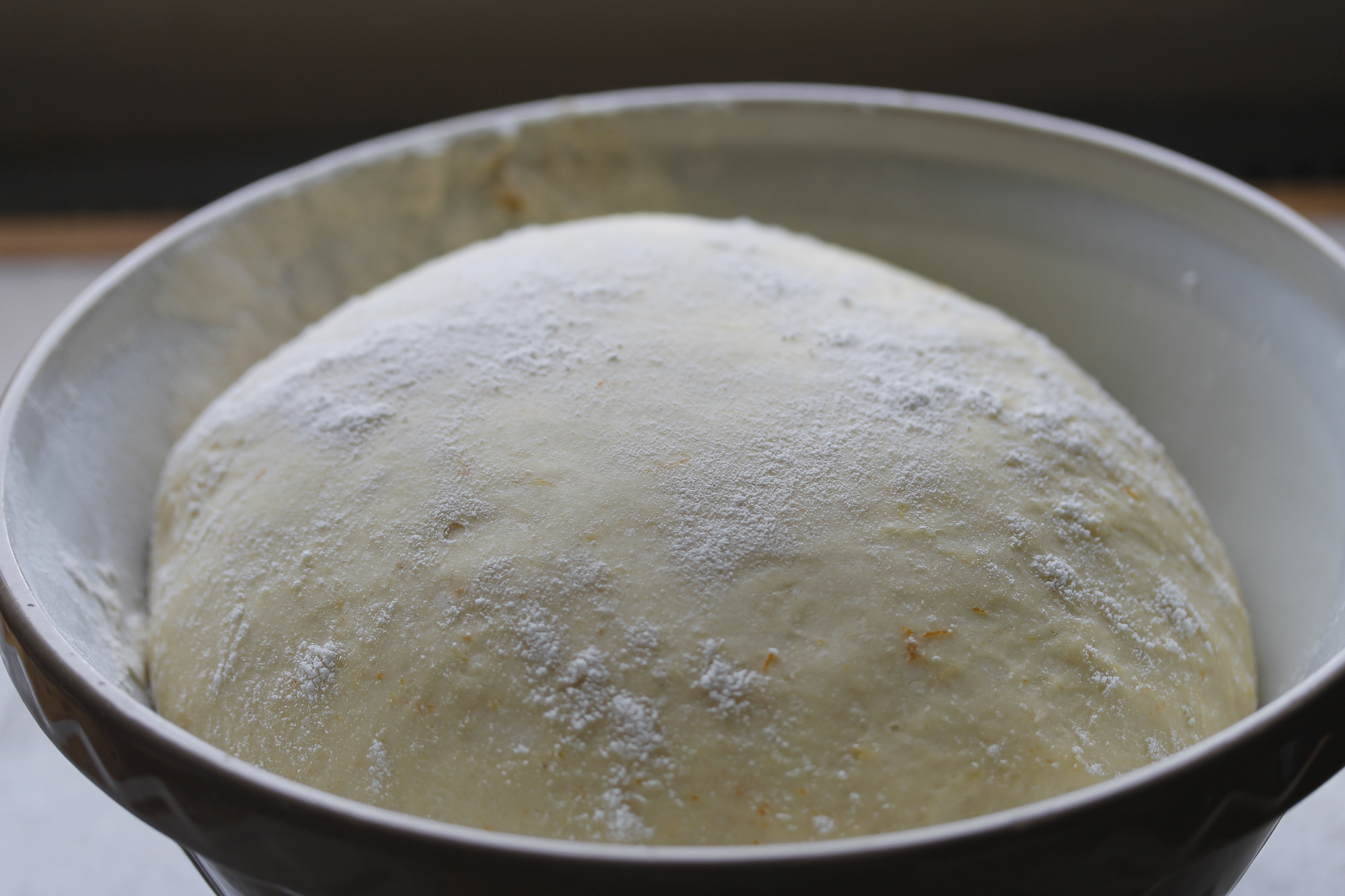 Ég byrjaði á að velgja 200 ml af mjólk, hella henni í hrærivélarskál og strá 1 msk af geri yfir. Lét þetta standa í nokkar mínútur. Á meðan blandaði ég 500 g af hveiti, 150 g af sykri (ónei, þetta er ekki sykurlaust) og ¾ tsk af salti saman í annarri skál og reif gula börkinn af 2 appelsínum fínt yfir.