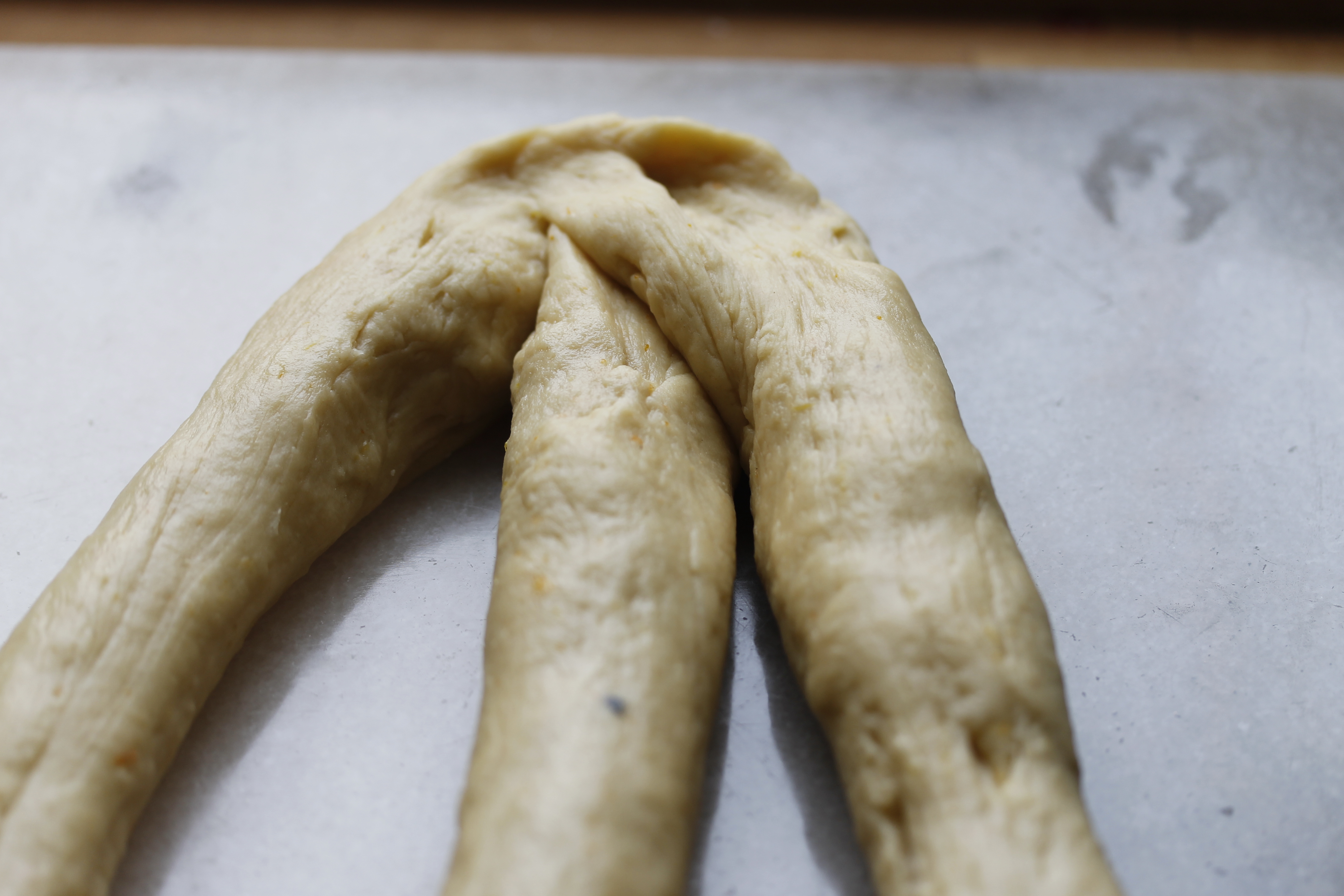 Ég sló svo deigið niður og skipti því í þrjá jafna hluta. Rúllaði hvern um sig út í lengju og reyndi að hafa þær allar álíka langar og sverar. Ég setti þær á pappírsklædda bökunarplötu og svo lagði ég annan endann á þeim öllum saman og þrýsti þeim saman með fingrunum.
