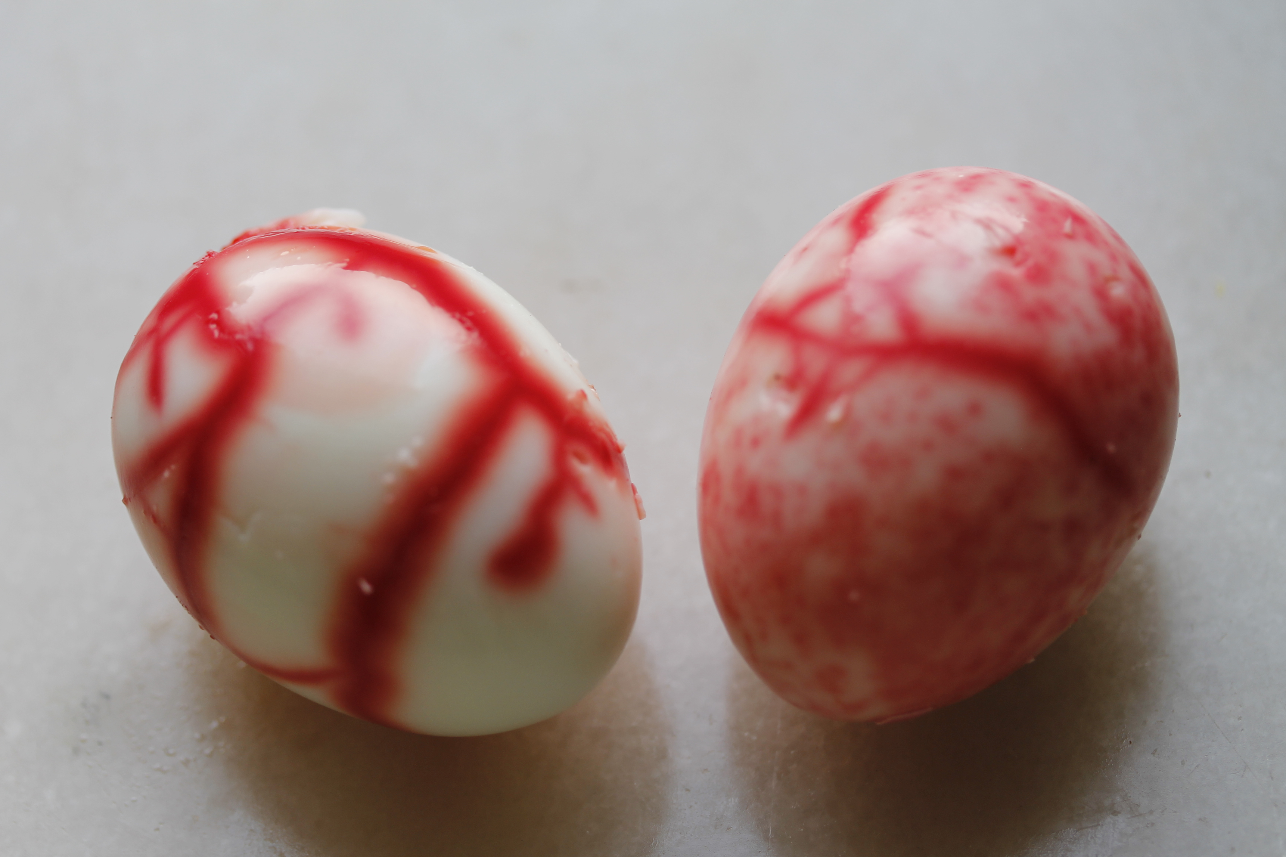 Ef maður sýður fleiri egg en notuð eru í brauðið má líka láta þau hálfkólna í litaða vatninu, taka þau svo upp úr og slá þeim létt við eitthvað til að brjóta skurnina en taka hana ekki af, heldur setja eggin aftur út í og láta þau kólna alveg í litaða vatninu. Þá verða þau einhvern veginn svona þegar skurnin er plokkuð af: