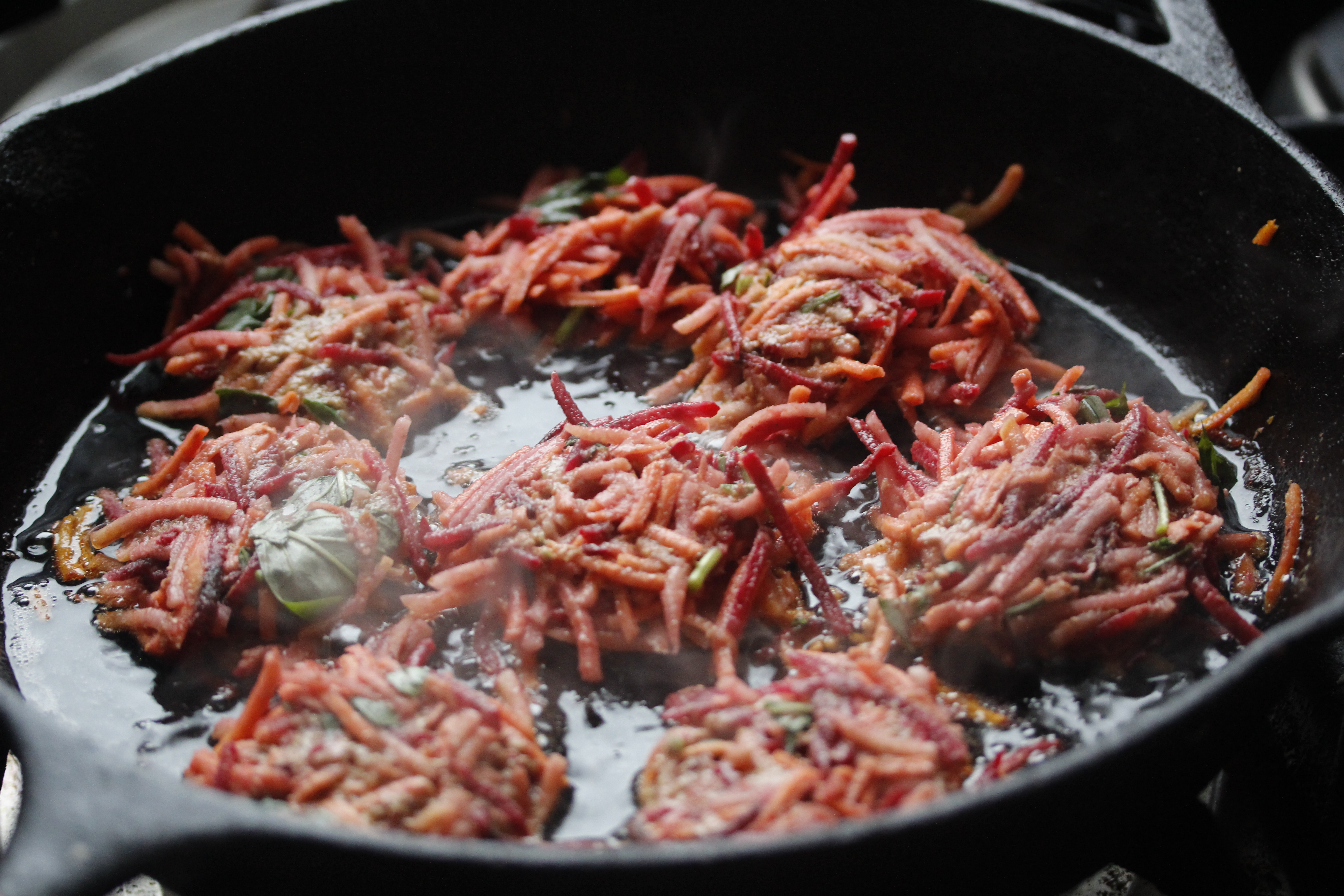 En ég byrjaði semsagt á að flysja og snyrta sæta kartöflu (200 g), gulrófu (200 g) og rauðrófu (100 g, þyngdin miðast við flysjað grænmeti). Síðan reif ég það það á fremur grófu rifjárni og reyndi að hafa grænmetislengjurnar sem lengstar. Mér finnst best að nota rifjárnið í matvinnsluvélinni til þess en ef það er ekki gert er best að hafa hanska þegar rauðrófan er rifin eða halda a.m.k. um hana með álpappírsbút.