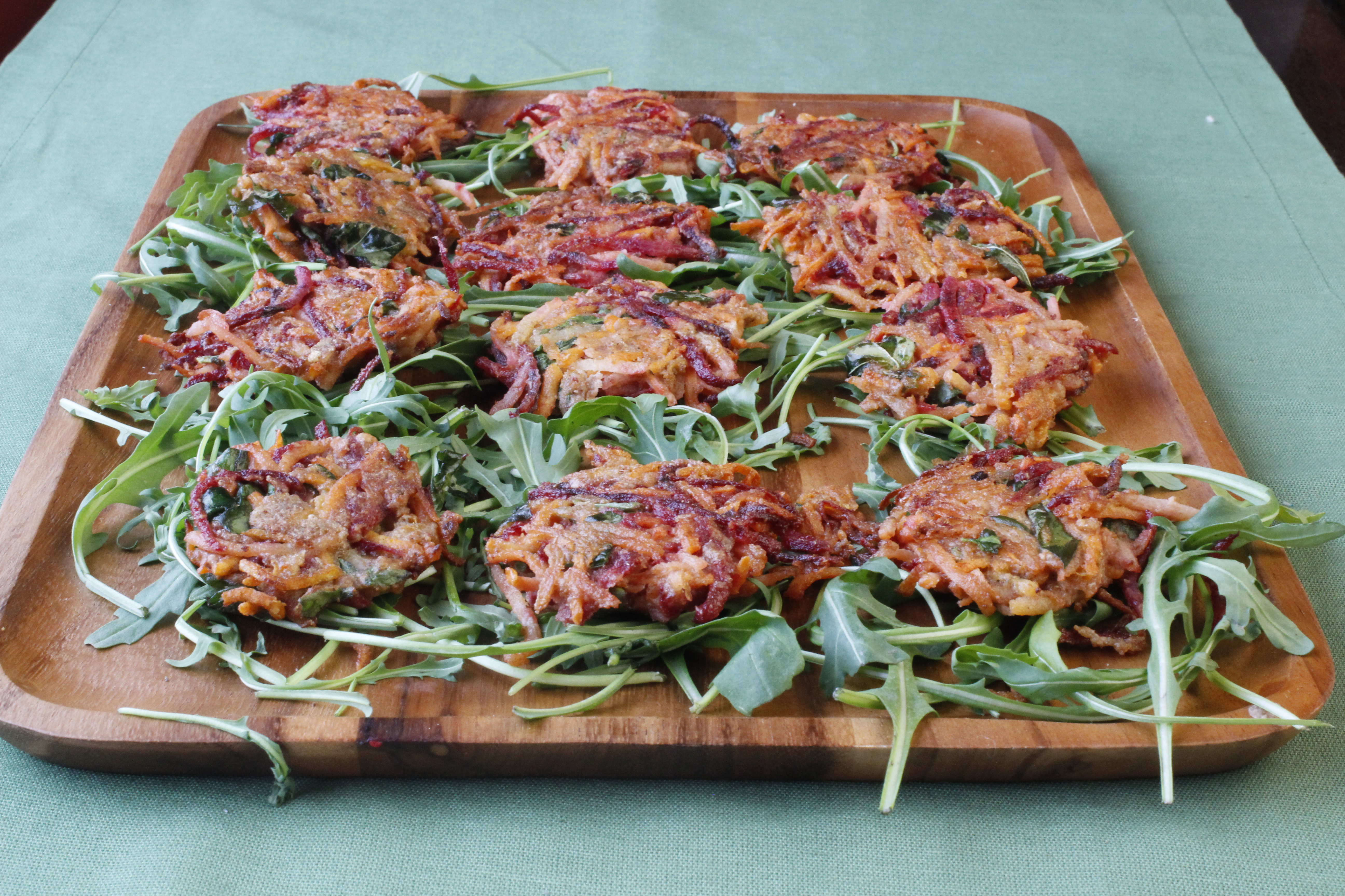 Úr þessu urðu 12-16 stykki hjá mér en geta vel orðið fleiri (eða færri), það fer eftir stærð auðvitað. Ég notaði sætar kartöflur, gulrófur og rauðrófur en það má breyta því og nota t.d. gulrætur, kartöflur eða sellerírót.