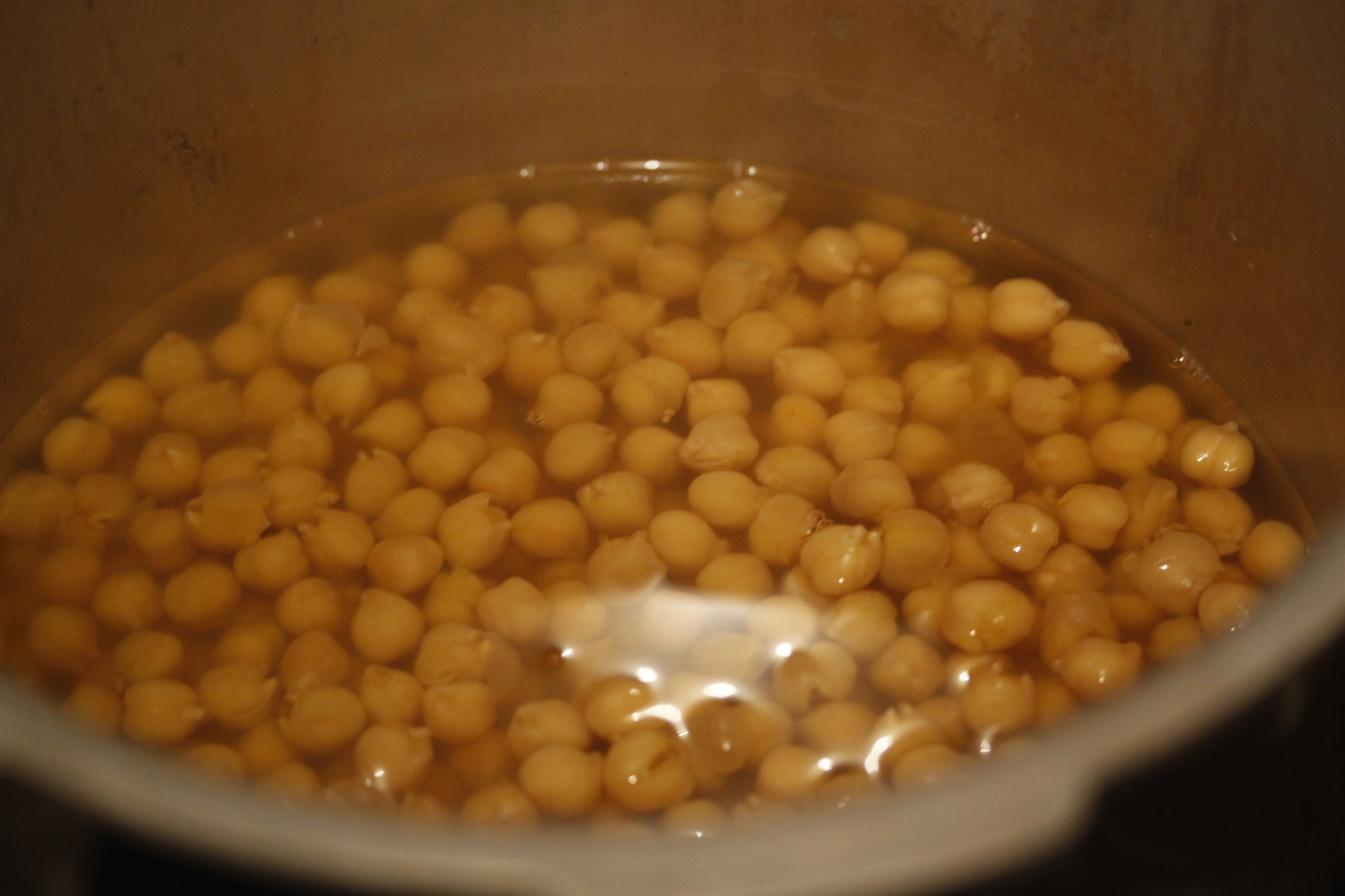 Þá var það hummusinn og ég byrjaði á að sjóða svona 115 g af þurrkuðum baunum – það ætti að gera um 250 g af soðnum – í þrýstisuðupottinum mínum en það má líka leggja þær í bleyti og sjóða á venjulegan hátt eða nota dósabaunir. Gott er að geyma smávegis af soðinu eða leginum úr dósinni til að þynna hummusinn eftir þörfum.