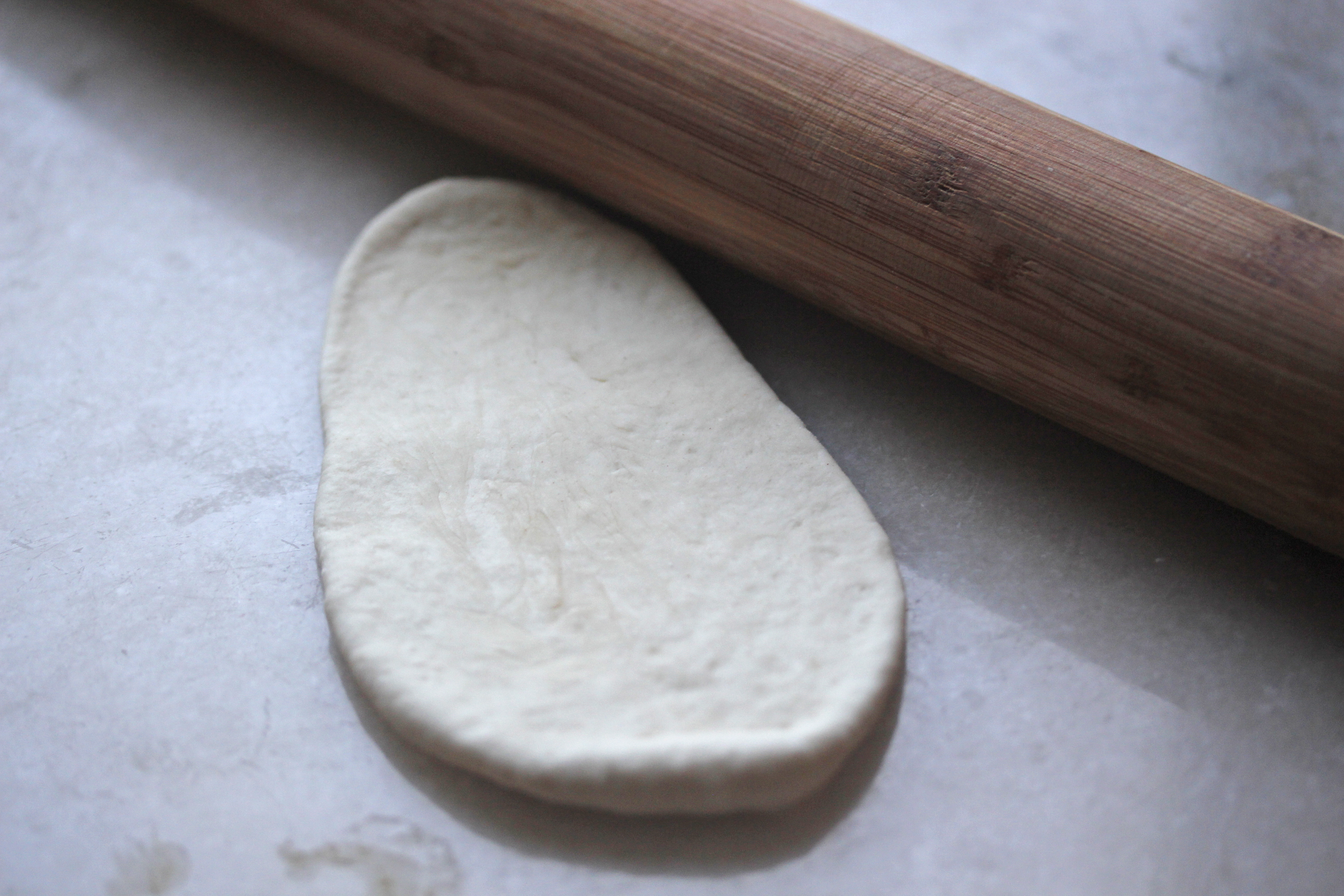 Ég setti 350 g af ylvolgu vatni og 1 msk af geri í skál og lét standa í nokkrar mínútur. Setti svo tæplega 500 g af brauðhveiti út í, ásamt 1 1/2 tsk af salti og 2 msk af ólífuolíu, hrærði vel saman og hnoðaði í nokkrar mínútur. Ég bætti við hveiti eftir þörfum; deigið á að vera fremur lint en þó ekki klessast við hendurnar að ráði. Svo mótaði ég það í kúlu, setti í skál, breiddi yfir og lét deigið lyfta sér í 1 1/2-2 klst. Þá hnoðaði ég deigið lauslega og skipti því í sex eða átta kúlur.