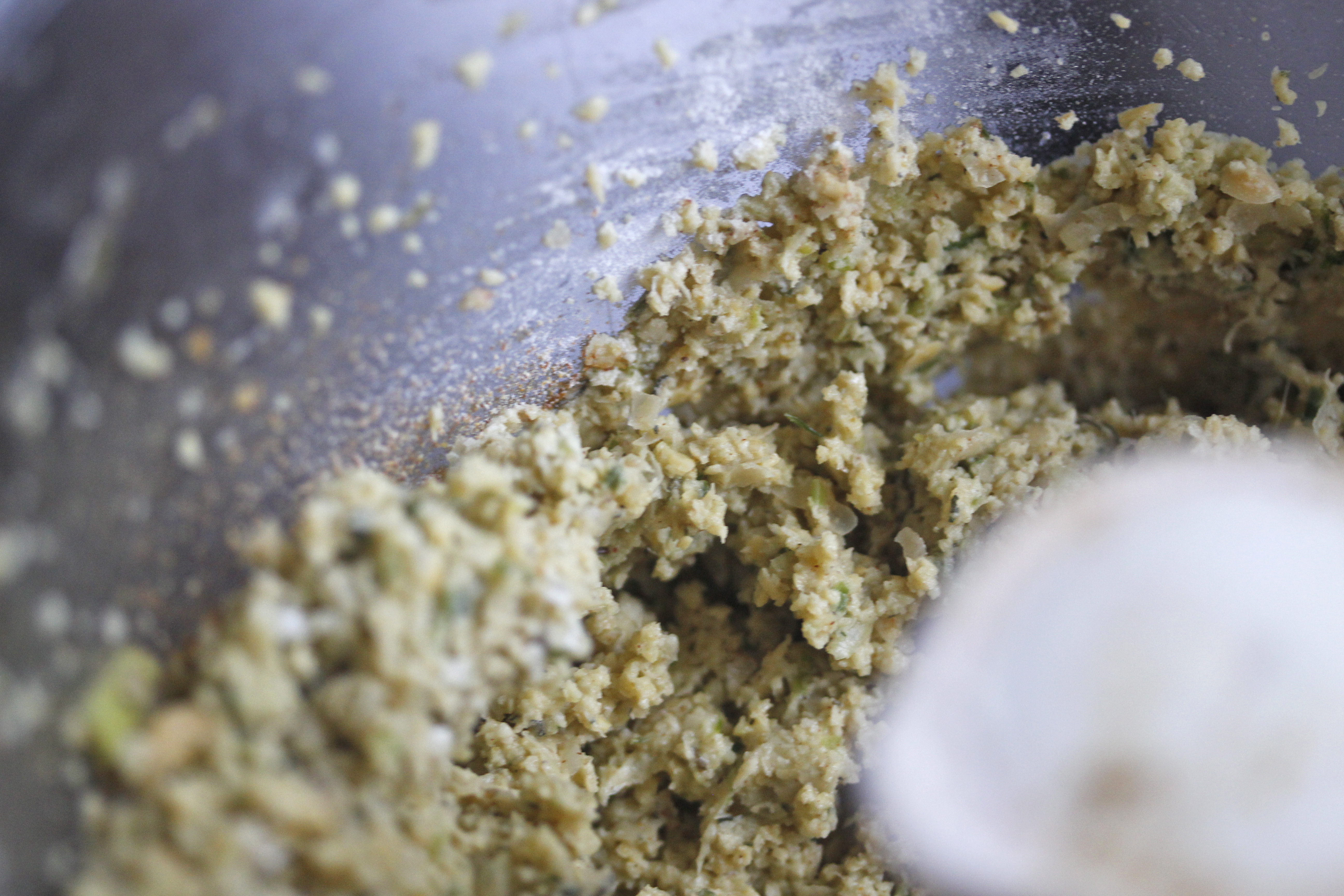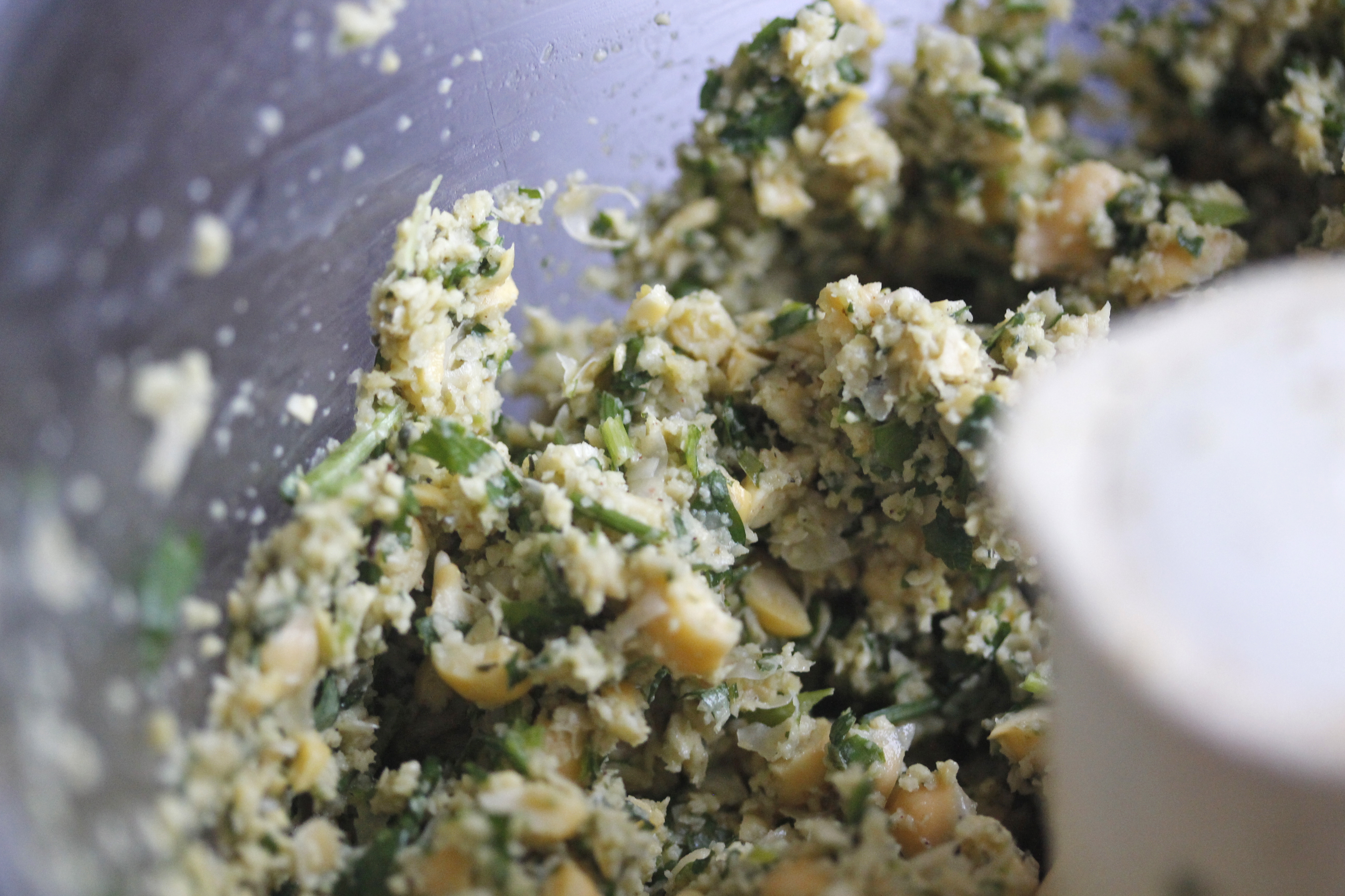 Ég byrjaði á að setja 200 g af þurrkuðum kjúklingabaunum í skál, hellti yfir þær svo miklu köldu vatni að það flaut a.m.k. 2 cm yfir þær og lét þær svo standa yfir nótt, eða helst í hálfan sólarhring í kæli (má vera heilan en ekki lengur en það). Þá hellti ég vatninu af baununum., tók u.þ.b. þriðjunginn frá og geymdi en settu hitt í matvinnsluvél með 3 hvítlauksgeirum, 2-3 vorlaukum, 1 tsk af kummini, 1 tsk af möluðu kóríanderfræi,¼ tsk af engiferdufti,¼ tsk af kanil,¼ tsk af pipar, chilipipar á hnífsoddi, ¾ tsk af salti og ½ tsk af lyftiduft og maukaði vel saman.