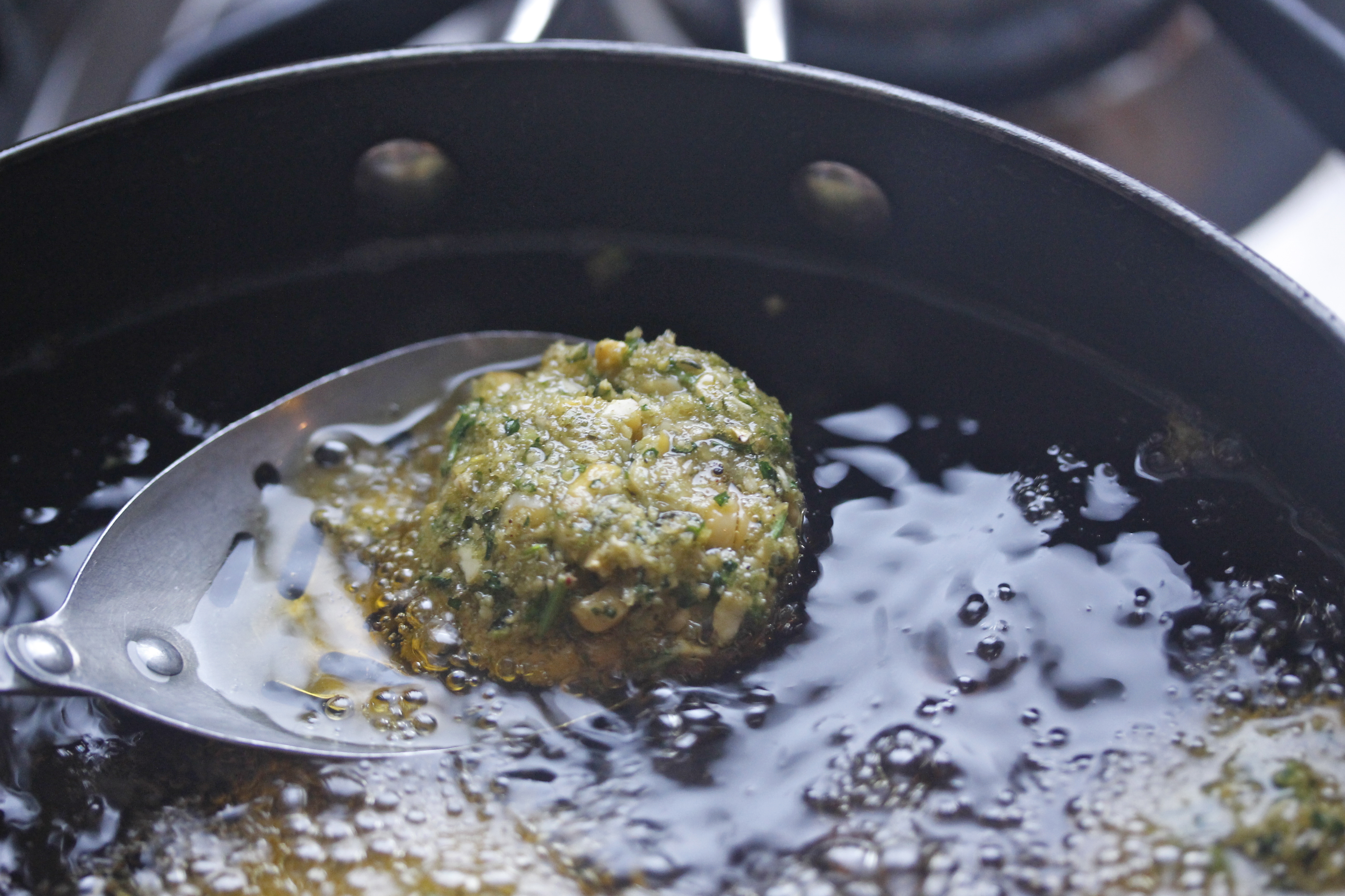 Ég mótaði kúlur úr maukinu, á stærð við heilar valhnetur eða aðeins stærri, og flatti þær svolítið út á milli lófanna. Ef blandan er mjög laus í sér og helst ekki saman má hræra dálitlu hveiti eða heilhveiti (eða brauðmylsnu) saman við til að binda hana betur. Ég hitaði svo olíu í um 180°C í víðum potti – hún ætti að vera a.m.k. 5 cm djúp – setti bollurnar gætilega út í og steikti þær í 2-3 skömmtum í nokkrar mínútur, þar til þær voru fallega gullinbrúnar og stökkar, og sneri þeim einu sinni. Tók þær upp með gataspaða og lét renna af þeim á eldhúspappír.
