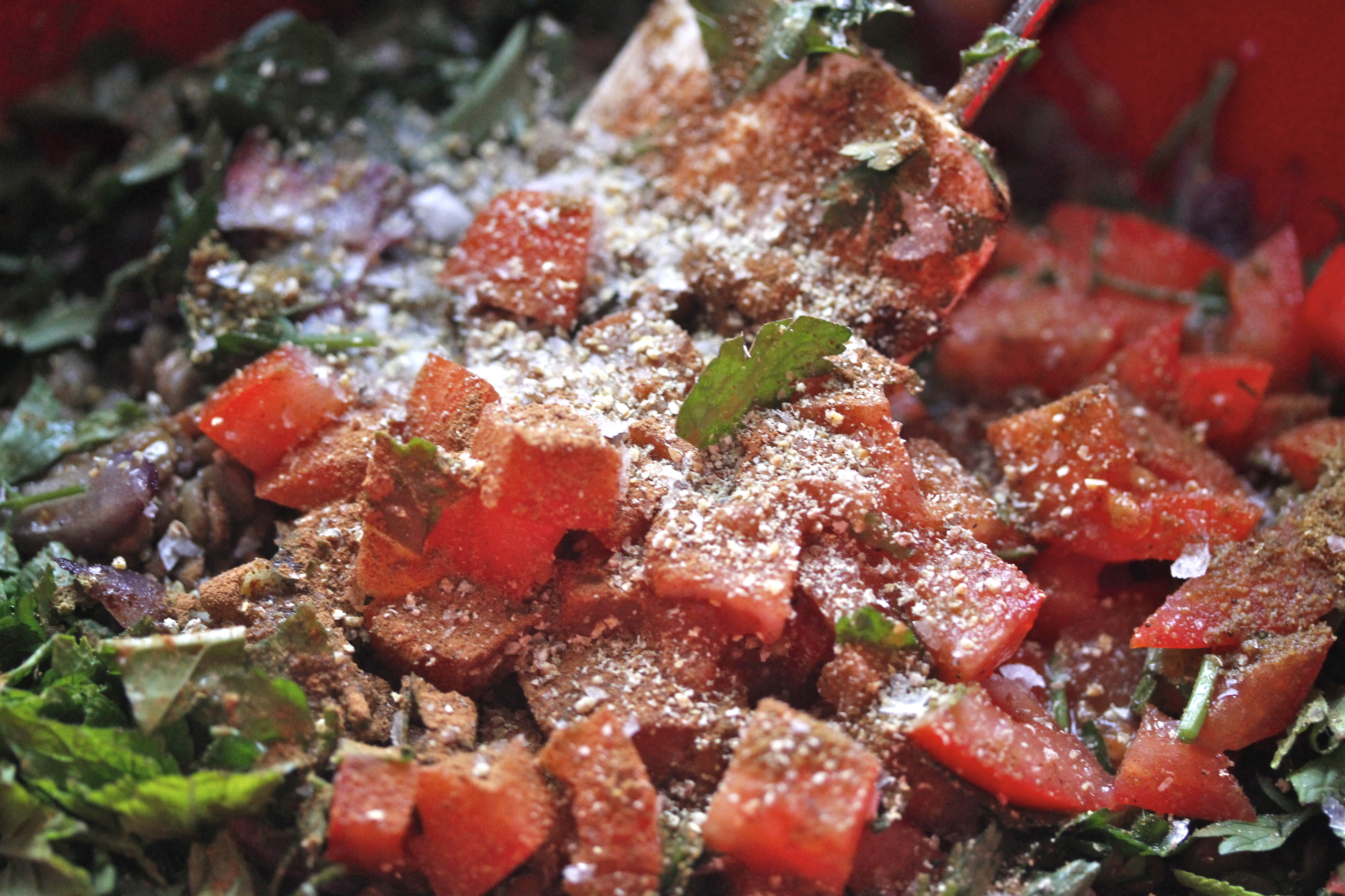 Svo tók ég einn stóran, vel þroskaðan og knallrauðan tómat (mætti vera tveir minni) og saxaði hann. Setti hann í skálina ásamt safa úr einni sítrónu, 1 tsk af kummini og ¼ tsk af kanel og blandaði vel. Smakkaði og bragðbætti með pipar og salti eftir þörfum.