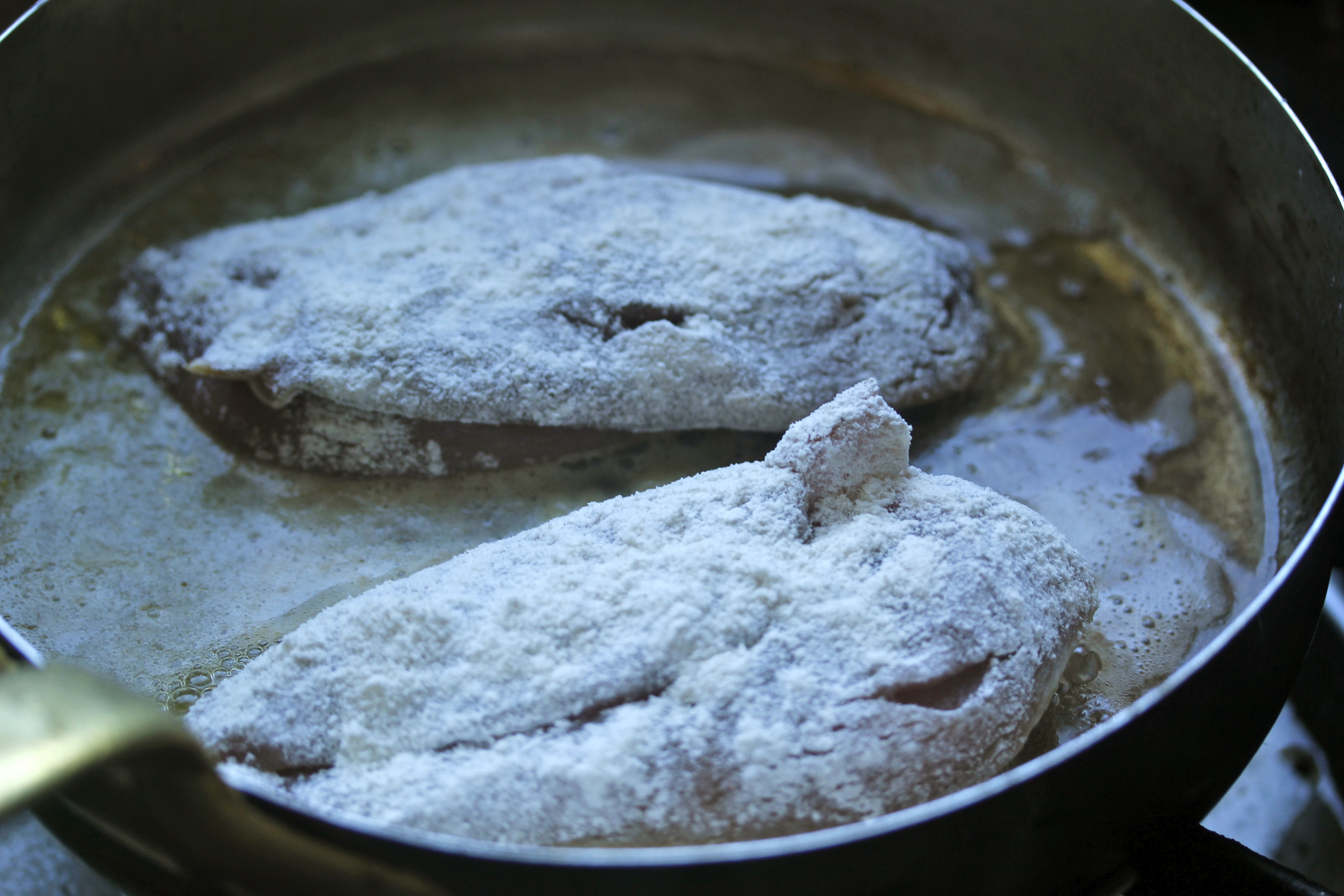 Á meðan tók ég bringurnar, sem voru búnar að þiðna í ísskápnum, og þerraði þær aðeins með eldhúspappír. Svo setti ég dálítið hveiti – svona 2 msk – á disk, kryddaði vel með pipar og salti og velti bringunum upp úr blöndunni.