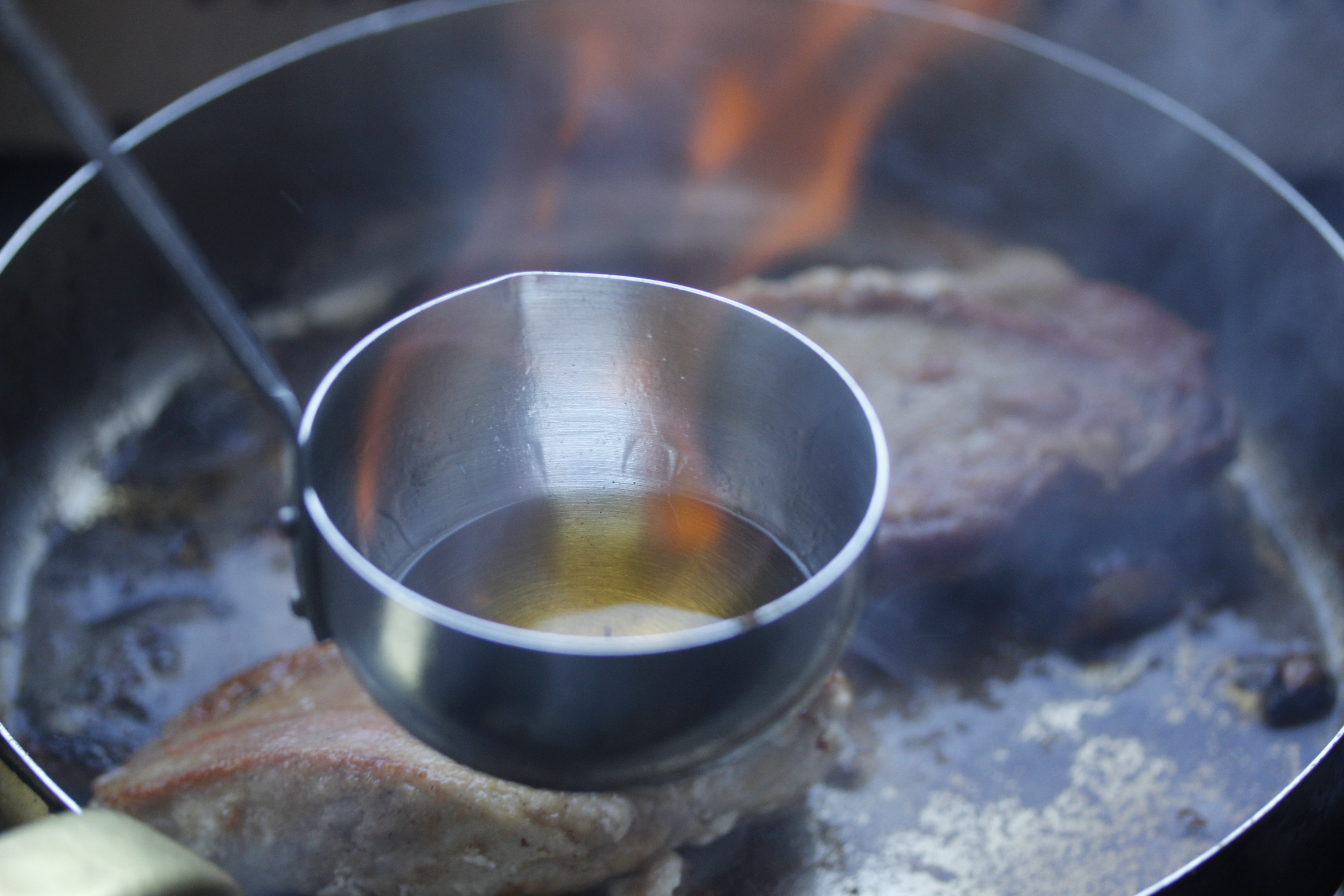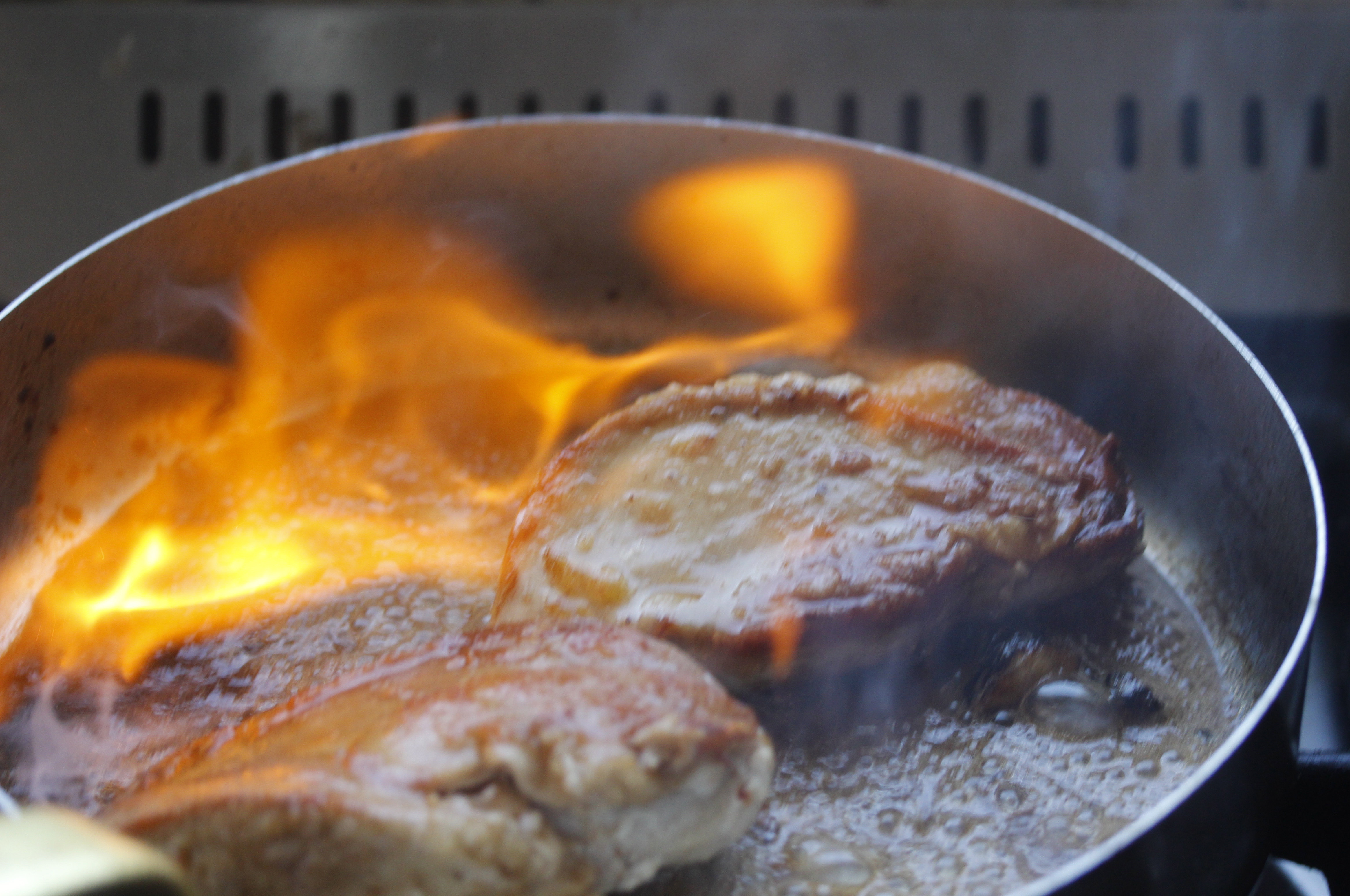 Ég er dálítill brennuvargur og finnst gaman að eldsteikja (flambera) svo að ég ákvað að gera það núna (en það má alveg sleppa því sko). Svo að ég hellti 2 msk af Grand Marnier (má líka vera koníak eða eitthvert annað áfengi) í ausu og hitaði með því að halda henni á pönnunni þar til líkjörinn var orðinn heitur. Það má líka hita hann í potti og svo má auðvitað hella honum beint á pönnuna og kveikja svo í, en ég vildi hella honum yfir fasanabringurnar en láta þær bara sjóða í honum.