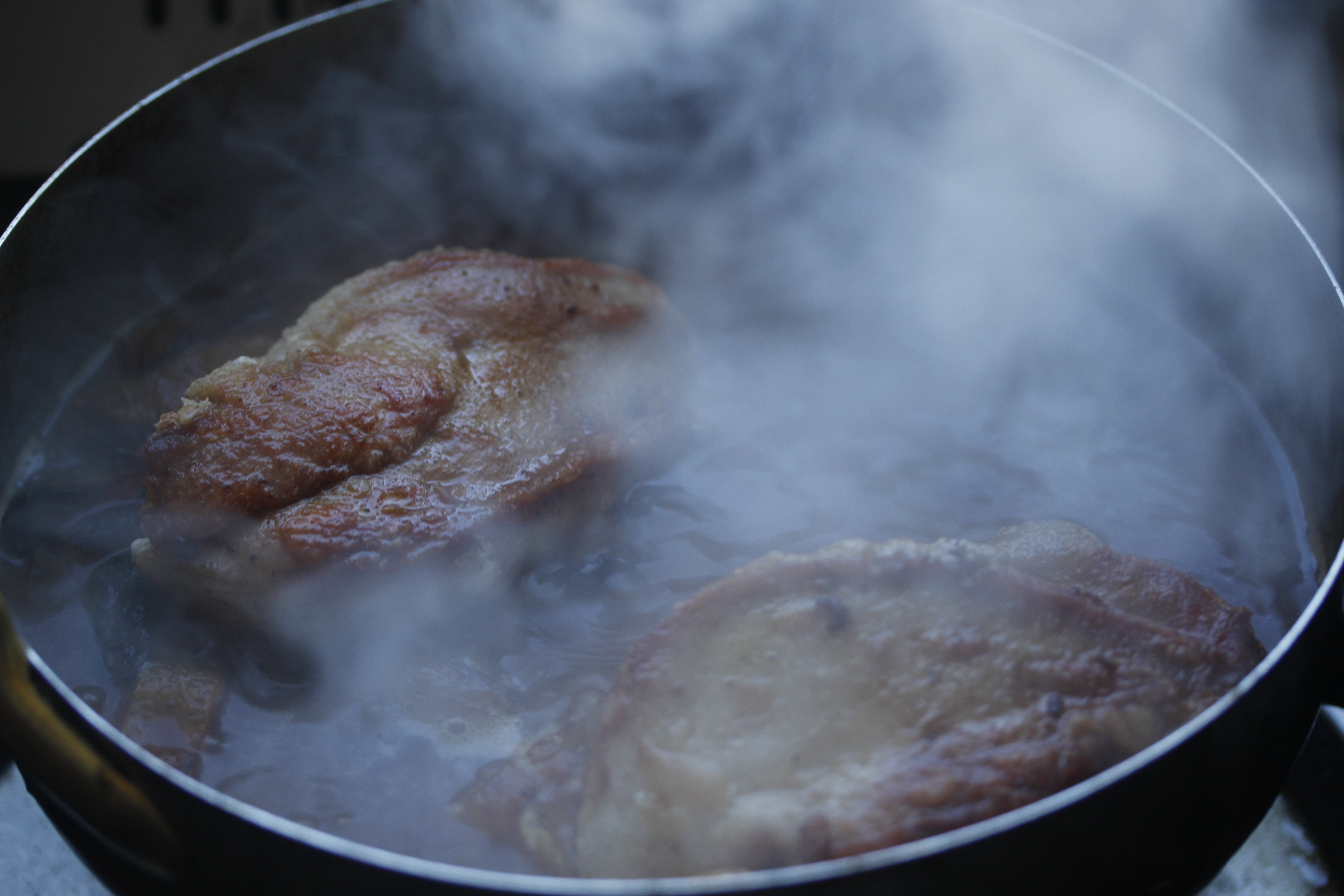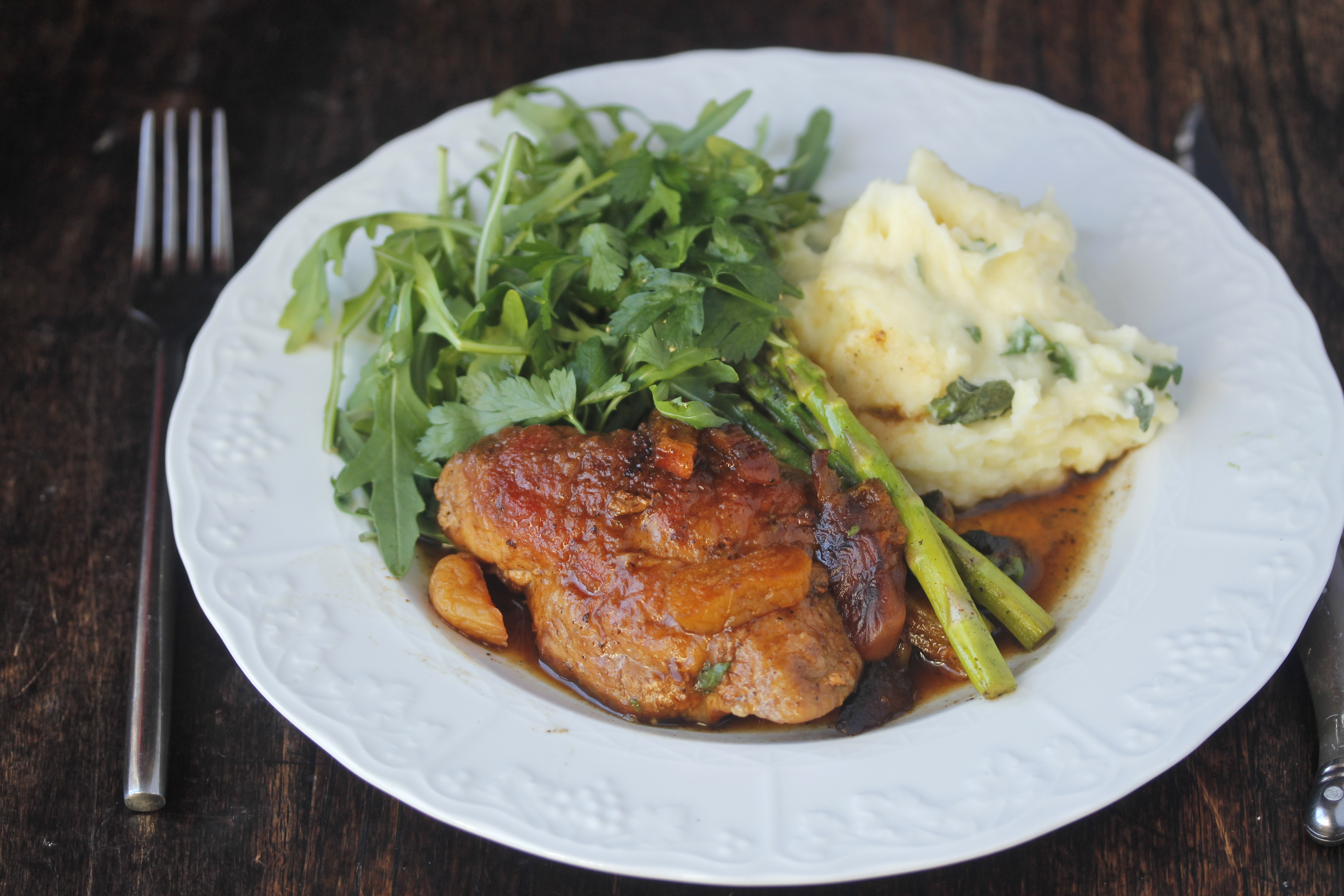 Þegar logarnir slokknuðu hellti ég svo 200 ml af heitu vatni yfir (ef apríkósurnar voru lagðar í bleyti er upplagt að nota vatnið af þeim), bætti við svolitlum villibráðarkrafti (eða kjúklingakrafti), setti lok yfir pönnuna og lét malla í 10 mínútur. Á meðan hellti ég vatninu af kartöflunum, sem voru akkúrat soðnar, stappaði þær með 50 g af smjöri, hrærði svo skvettu af rjóma (eða mjólk) saman við, kryddaði með pipar og salti og svo átti ég nokkur basilíkublöð sem lágu undir skemmdum svo ég saxaði þau og hrærði saman við stöppuna, en það er nú ekkert nauðsynlegt.